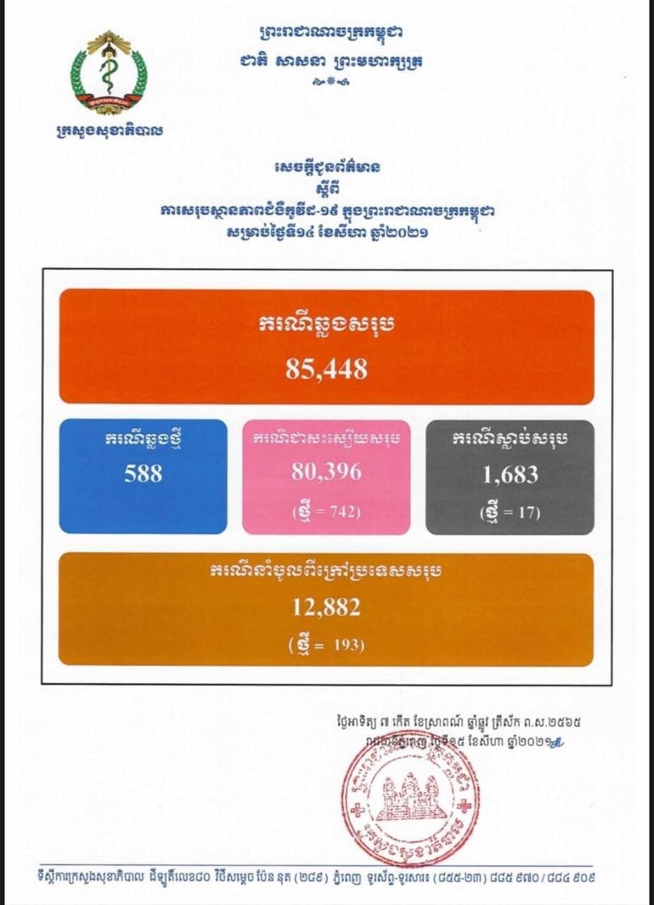 ក្រសួងសុខាភិបាល នៅថ្ងៃទី១៥ ខែសីហា ឆ្នាំ២០២១នេះ បានប្រកាសព័ត៌មាន បញ្ជាក់ពីការ រឃើញអ្នកឆ្លងកូវីដ១៩ថ្មី ចំនួន ៥៨៨នាក់, ជាសះស្បើយចំនួន៧៤២នាក់ និងស្លាប់ថ្មីចំនួន១៧នាក់។