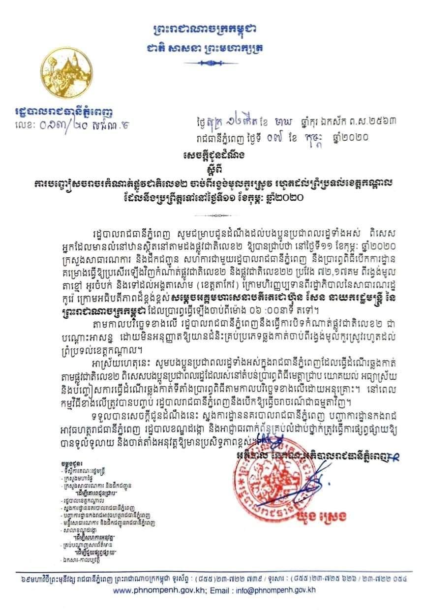 រដ្ឋបាលរាជធានីភ្នំពេញ ជូនដំណឹងពីការបញ្ចៀសចរាចរលើកំណាត់ផ្លូវជាតិលេខ២ ចាប់ពីរង្វង់មូលគួរស្រូវ រហូតព្រំប្រទល់ខេត្តកណ្តាលនៅថ្ងៃ១១ ខែកុម្ភៈព័ត៌មានអត្ថបទដោយ៖Kien Sereyvuth Kien SereyvuthIT Technical Supportអត្ថបទមុនអត្ថបទបន្ទាប់