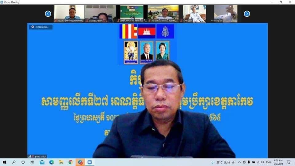 តាកែវ៖ ឯកឧត្តម យស ណាស៊ី ប្រធានក្រុមប្រឹក្សាខេត្ត រួមជាមួយនឹង ឯកឧត្តម លោកជំទាវ សមាជិកក្រុមប្រឹក្សា នៅព្រឹកថ្ងៃព្រហស្បតិ៍ ទី០២ ខែកញ្ញា ឆ្នាំ២០២១នេះ បានបើកកិច្ចប្រជុំសាមញ្ញលើកទី២៧ អាណត្តិទី៣ របស់ក្រុមប្រឹក្សាខេត្ត តាមរយ:ប្រព័ន្ធអនឡាញ (Zoom Meeting) ជាមួយរដ្ឋបាលខេត្ត ដោយមានការអញ្ជើញចូលរួមពី ឯកឧត្តម អ៊ូច ភា អភិបាល នៃគណៈអភិបាលខេត្តតាកែវ លោក លោកស្រី អភិបាលរងខេត្ត លោក លោកស្រី ប្រធានមន្ទីរអង្គភាពជុំវិញខេត្ត កម្លាំងទាំងបីប្រភេទ និងលោក លោកស្រី មន្ត្រីពាក់ព័ន្ធ។