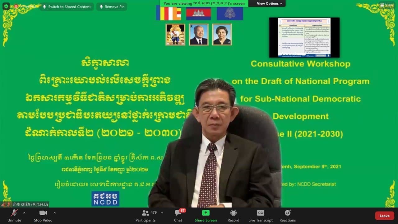 សិក្ខាសាលាពិគ្រោះយោបល់លើ “សេចក្តីព្រាងឯកសារកម្មវិធីជាតិសម្រាប់ការអភិវឌ្ឍតាមបែបប្រជាធិបតេយ្យនៅថ្នាក់ក្រោមជាតិ ដំណាក់កាលទី២ (២០២១- ២០៣០) ត្រូវបានរៀបចំឡើងដោយលេខាធិការដ្ឋាន គ.ជ.អ.ប រយៈពេលមួយថ្ងៃ គឺនៅថ្ងៃព្រហស្បតិ៍ ៣កើត ខែភទ្របទ ឆ្នាំឆ្លូវ ត្រីស័ក ព.ស ២៥៦៥ ត្រូវនឹងថ្ងៃទី០៩ ខែកញ្ញា ឆ្នាំ២០២១ តាមរយៈប្រព័ន្ធបញ្ជូនរូបភាព និងសំឡេងពីចម្ងាយ (Zoom) ដោយមានអ្នក ចូលរួមប្រមាណ ៤០០នាក់ ដែលជាតំណាងថ្នាក់ដឹកនាំក្រសួង ស្ថាប័នពាក់ព័ន្ធ និងរដ្ឋបាលរាជធានី ខេត្ត ក្រុង ស្រុក ខណ្ឌ។