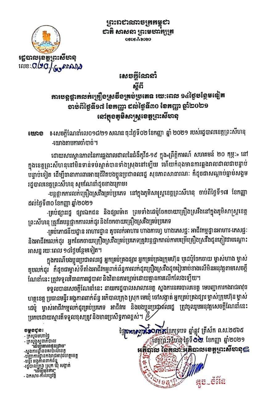 *បន្តផ្អាកការលក់គ្រឿងស្រវឹងគ្រប់ប្រភេទ នៅក្នុងភូមិសាស្ត្រខេត្តព្រះសីហនុ ចាប់ពីថ្ងៃទី១៧ ខែកញ្ញាដល់ថ្ងៃទី៣០ ខែកញ្ញា ឆ្នាំ២០២១