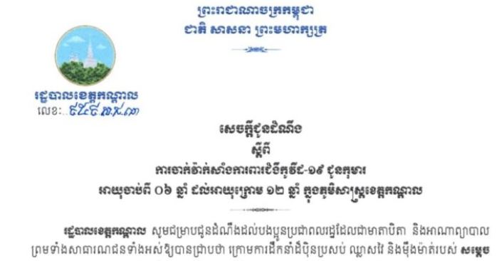 ខេត្តកណ្តាល ចេញសេចក្តីជូនដំណឹងស្តីពី ការចាក់វ៉ាក់សាំងការពារជំងឺកូវីដ-១៩ ជូនកុមារអាយុចាប់ពី ០៦ឆ្នាំ ដល់អាយុក្រោម ១២ឆ្នាំ