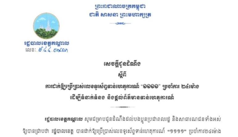 ខេត្តកណ្ដាល ប្រកាសដាក់ឱ្យប្រើប្រាស់លេខទូរស័ព្ទទាន់ហេតុការណ៍ “១១១១” ប្រចាំការ២៤ម៉ោង