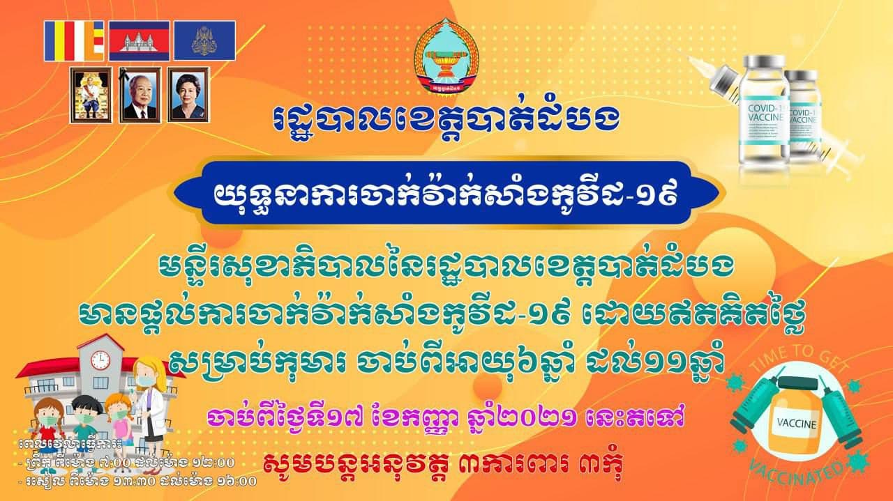 រដ្ឋបាលខេត្តបាត់ដំបង ចេញសេចក្តីជូនដំណឹងស្តីពីការផ្តល់និងការចាក់វ៉ាក់សាំង ជូនដល់កុមារចាប់ពីអាយុ៦ឆ្នាំដល់១២ឆ្នាំ ក្នុងក្របខ័ណ្ឌទូទាំងខេត្តបាត់ដំបង ចាប់ពីថ្ងៃទី១៧ខែកញ្ញាឆ្នាំ២០២១នេះតទៅ