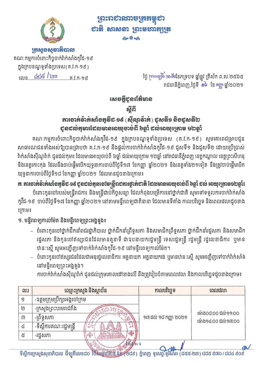 ក្រសួងសុខាភិបាល សេចក្ដីជូនព័ត៌មាន ស្ដីពីការចាក់វ៉ាក់សាំងកូវីដ-១៩ (ស៊ីណូវ៉ាក់)ដូសទី១ និងដូសទី២ ជូនដល់កុមារដែលមានអាយុចាប់ពី ៦ឆ្នាំដល់អាយុក្រោម ១២ឆ្នាំ