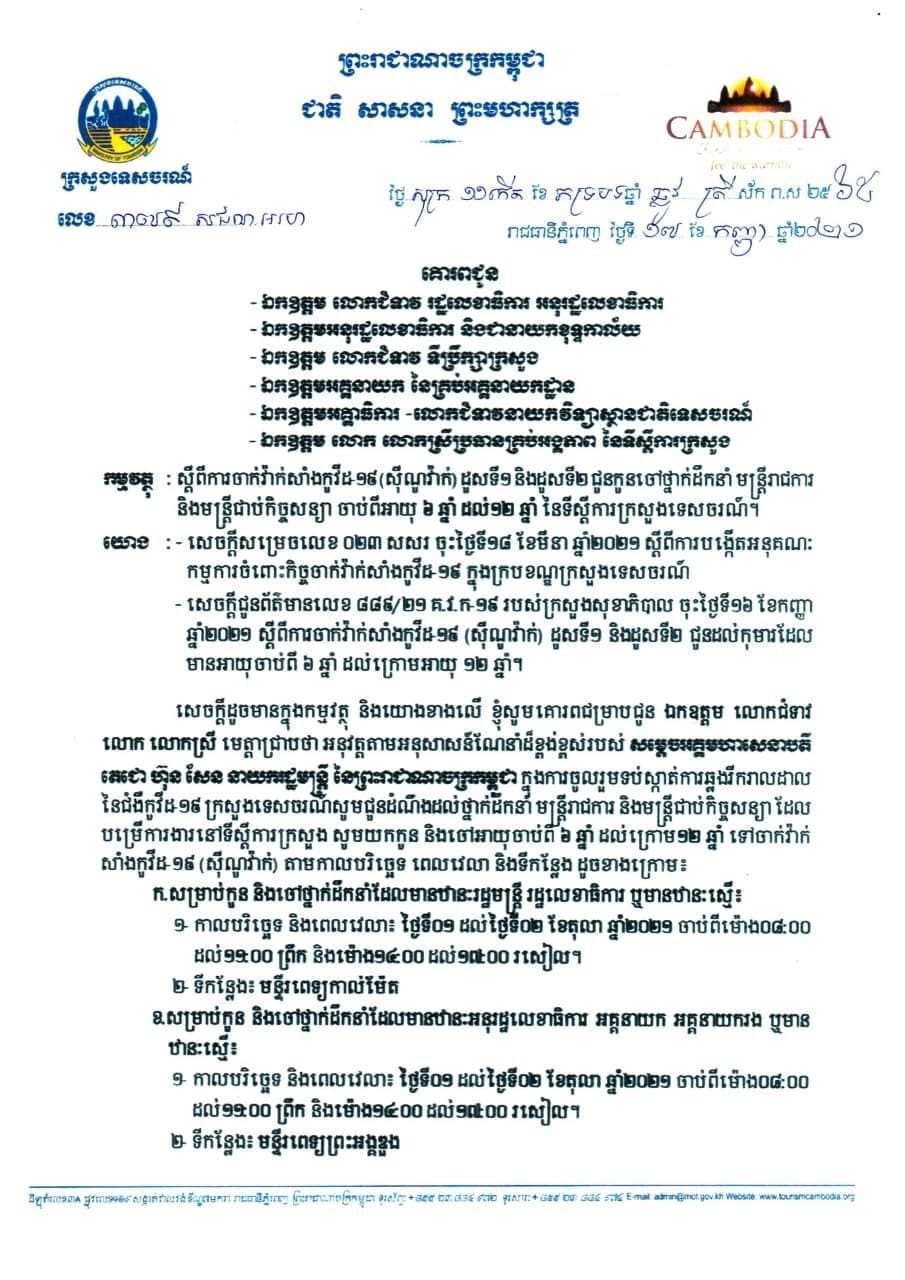 សេចក្តីជូនដំណឹងលេខ ៣៧៩ សជណ អរហ ចុះថ្ងៃទី១៧ ខែកញ្ញា ឆ្នាំ២០២១ របស់ក្រសួងទេសចរណ៍ ស្តីពី ការចាក់វ៉ាសាំងកូវីដ១៩ (សុីណូវ៉ាក់) ដូសទី១ និងដូសទី២ ជូនកូនចៅថ្នាក់ដឹកនាំមន្ត្រីរាជការ និងមន្ត្រីជាប់កិច្ចសន្យា ចាប់ពីអាយុ៦ ឆ្នាំដល់១២ឆ្នាំ នៃទីស្ដីការក្រសួងទេសចរណ៍
