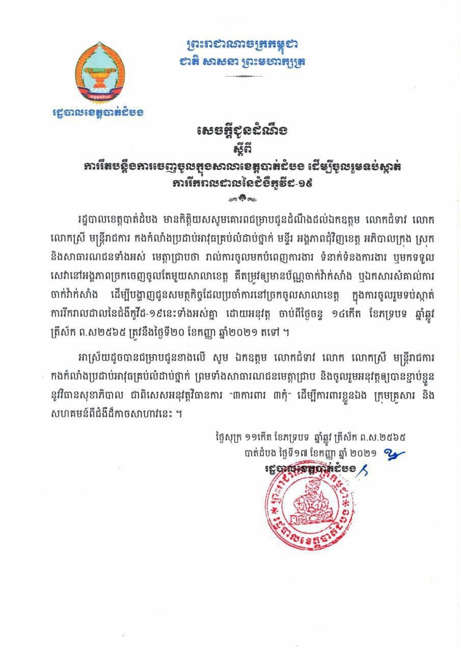 រដ្ឋបាលខេត្តបាត់ដំបង បានចេញ នូវ សេចក្តីជូនដំណឹង ស្តីពីការរឹតបន្តឹងនូវការចេញ-ចូលក្នុងសាលាខេត្តបាត់ដំបង ចាប់ពីថ្ងៃទី២០ខែកញ្ញាឆ្នាំ២០២១តទៅ ដើម្បីចូលរួមនូវក្នុងការទប់ស្កាត់ការឆ្លងរាលដាលនៃជំងឺកូវីដ-19