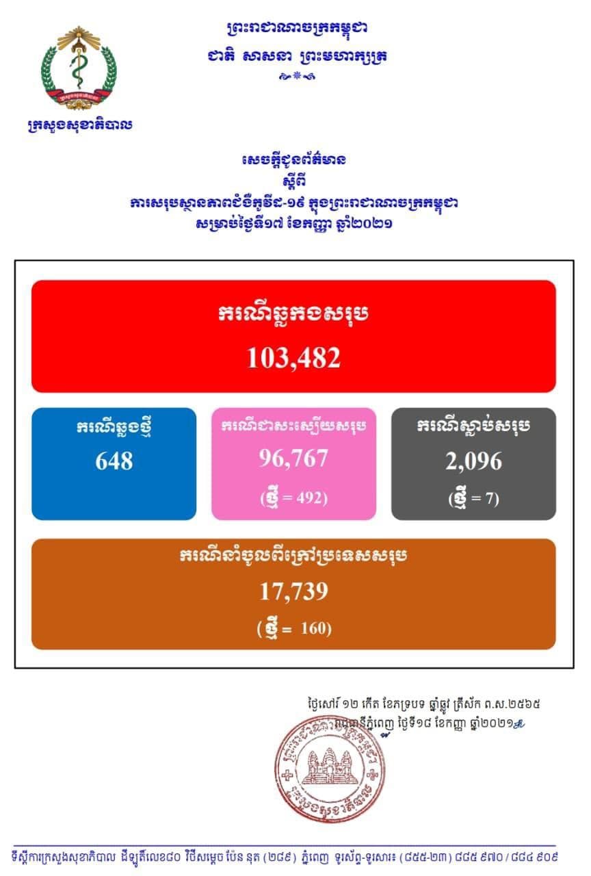 ភ្នំពេញ ៖ ក្រសួងសុខាភិបាល នៅថ្ងៃទី១៨ ខែកញ្ញាឆ្នាំ២០២១នេះ បានចេញសេចក្តីប្រកាសព័ត៌មាន បញ្ជាក់ពីការបន្តរកឃើញអ្នកឆ្លងកូវីដ១៩ ថ្មីចំនួន ៦៤៨នាក់, អ្នកជំងឺ ចំនួន ៤៩២នាក់ជាសះស្បើយ និងអ្នកស្លាប់ថ្មីចំនួន ៧នាក់ ៕