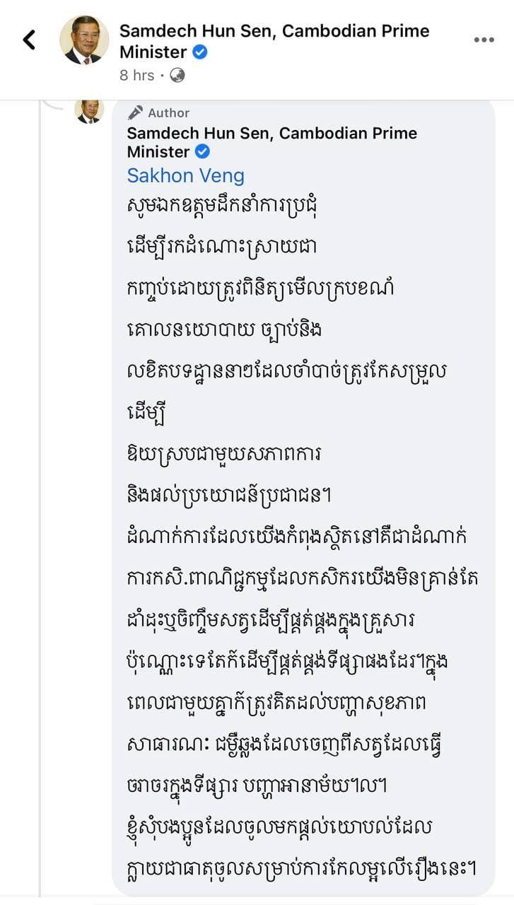 សម្តេចតេជោ ហ៊ុន សែន បានសរសេរ Comments ក្នុង Facebook របស់យ៉ាងដូច្នេះថា «សូមឯកឧត្តម [រដ្ឋមន្ត្រីកសិកម្ម] ដឹកនាំការប្រជុំ ដើម្បីរកដំណោះស្រាយជាកញ្ចប់ ដោយត្រូវពិនិត្យមើលក្របខណ្ឌគោលនយោបាយច្បាប់ និងលខិតបទដ្ឋាននានា ដែលចាំបាច់ត្រូវកែសម្រួល ដើម្បីឲ្យស្របជាមួយសភាពការណ៍ និងផល់ប្រយោជន៍ប្រជាជន»។