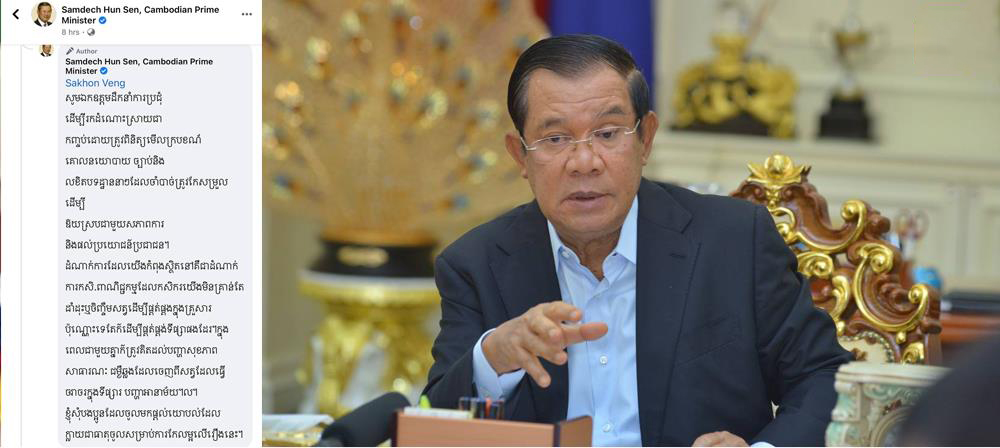 សម្តេចតេជោ ហ៊ុន សែន បានសរសេរ Comments ក្នុង Facebook របស់យ៉ាងដូច្នេះថា «សូមឯកឧត្តម [រដ្ឋមន្ត្រីកសិកម្ម] ដឹកនាំការប្រជុំ ដើម្បីរកដំណោះស្រាយជាកញ្ចប់ ដោយត្រូវពិនិត្យមើលក្របខណ្ឌគោលនយោបាយច្បាប់ និងលខិតបទដ្ឋាននានា ដែលចាំបាច់ត្រូវកែសម្រួល ដើម្បីឲ្យស្របជាមួយសភាពការណ៍ និងផល់ប្រយោជន៍ប្រជាជន»។