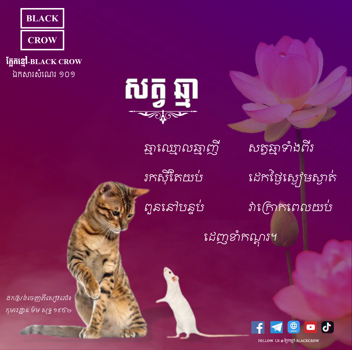បទកាកគតិ ៖ ស្ដីពីសត្វឆ្មាក្អែកខ្មៅឯកសារសំណេរអត្ថបទដោយ៖លី ប៊ុនហេង - Ly Bunheng ដងស្រង់ចេញពីសៀវភៅ ៖ កុមារដ្ឋាន ម៉ម សុទ្ធ ១៩៥២ #បទកាកគតិ#សត្វឆ្មា#ក្អែកខ្មៅ Facebook Page: Black-CrowTelegram Channel លី ប៊ុនហេង - Ly Bunhengលី ប៊ុនហេង ប្រធានផ្នែកផ្សព្វផ្សាយ នៃសច្ចធម៌ប្រវត្តិសាស្រ្ដអត្ថបទមុនអត្ថបទបន្ទាប់