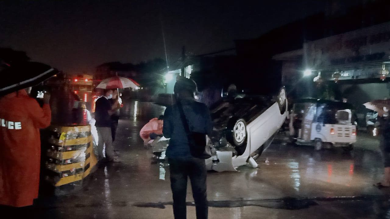 ភ្នំពេញ ៖ បុរសម្នាក់បានបើករថយន្ត Toyota Prius មួយគ្រឿងខណៈមេឃកំពុងភ្លៀងខ្លាំង ក៏រេចង្កូតបុករបាំងថ្មពុះចែកទ្រូងផ្លូវពេញទំហឹងបណ្ដាលឲ្យវៀចមួយកង់ ឯរថយន្តក្រឡាប់ផ្ងារជើងទ្រមេឃ កាលពីវេលាម៉ោង ១២ និង ៥០ នាទីយប់រំលងអាធ្រាត្រឈានចូលថ្ងៃទី ២៨ ខែកញ្ញាឆ្នាំ ២០២១ នៅខាងលិចស្តុបណូគា តាមបណ្ដោយផ្លូវ ២០០៤ កែងនឹងផ្លូវ ២៧១ សឡា ក្នុងសង្កាត់អូរបែកក្អម ខណ្ឌសែនសុខ រាជធានីភ្នំពេញ។