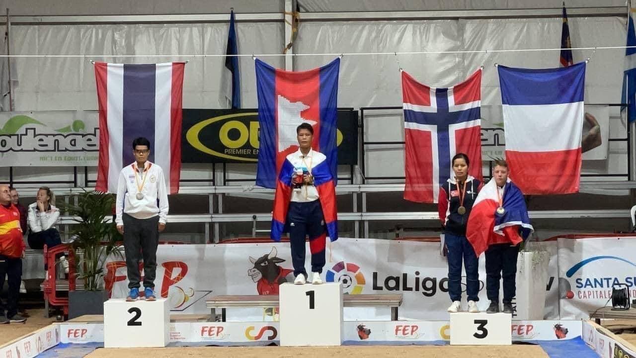 អបអរសាទរ ពិធីបំពាក់មេដាយមាសផ្លូវការ ជូនកីឡាការិនីប៉េតង់ជម្រើសជាតិកម្ពុជា អ៊ុក ស្រីមុំដែលឈ្នះការប្រកួតលើវិញ្ញាសាវាយយកពិន្ទុ ផ្នែកនារី នៅទីក្រុង Santa Susanna ប្រទេសអេស្ប៉ាញ។ ការប្រកួតចាប់ពីថ្ងៃទី១២ ដល់ថ្ងៃទី ១៤ ខែវិច្ឆិកា ឆ្នាំ២០២១។ នេះជាឆ្នាំទី៥នៃការឈ្នះមេដាយមាសលើវិញ្ញាសាវាយយកពិន្ទុ របស់កម្ពុជា ដោយមិនទាន់មានប្រទេសណាក្រៅពីកម្ពុជានៅលើពិភពលោកធ្វើបានបែបនេះនៅឡើយទេ៕
