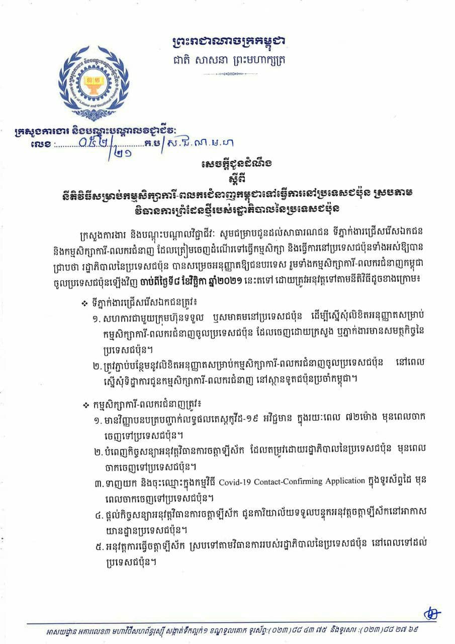 រាជធានីភ្នំពេញ៖ក្រសួងការងារ និងបណ្តុះបណ្តាលវិជ្ជាជីវៈនៅថ្ងៃទី ១៥ ខែវិច្ឆិកា ឆ្នាំ ២០២១នេះ បានចេញសេចក្តីជូនដំណឹងមួយដល់សាធារណជន ទីភ្នាក់ងារជ្រើសរើសឯកជន និងកម្មសិក្សាការី-ពលករជំនាញ ដែលត្រៀមចេញដំណើរទៅធ្វើកម្មសិក្សា និងធ្វើការនៅប្រទេសជប៉ុនទាំងអស់ឱ្យបាន ជ្រាបថា រដ្ឋាភិបាលនៃប្រទេសជប៉ុន បានសម្រេចអនុញ្ញាតឱ្យជនបរទេស រួមទាំងកម្មសិក្សាការី-ពលករជំនាញកម្ពុជា ចូលប្រទេសជប៉ុនឡើងវិញ ចាប់ពីថ្ងៃទី៨ ខែវិច្ឆិកា ឆ្នាំ២០២១ នេះតទៅ ដោយត្រូវអនុវត្តទៅតាមនីតិវិធីដូចខាងក្រោម៖
