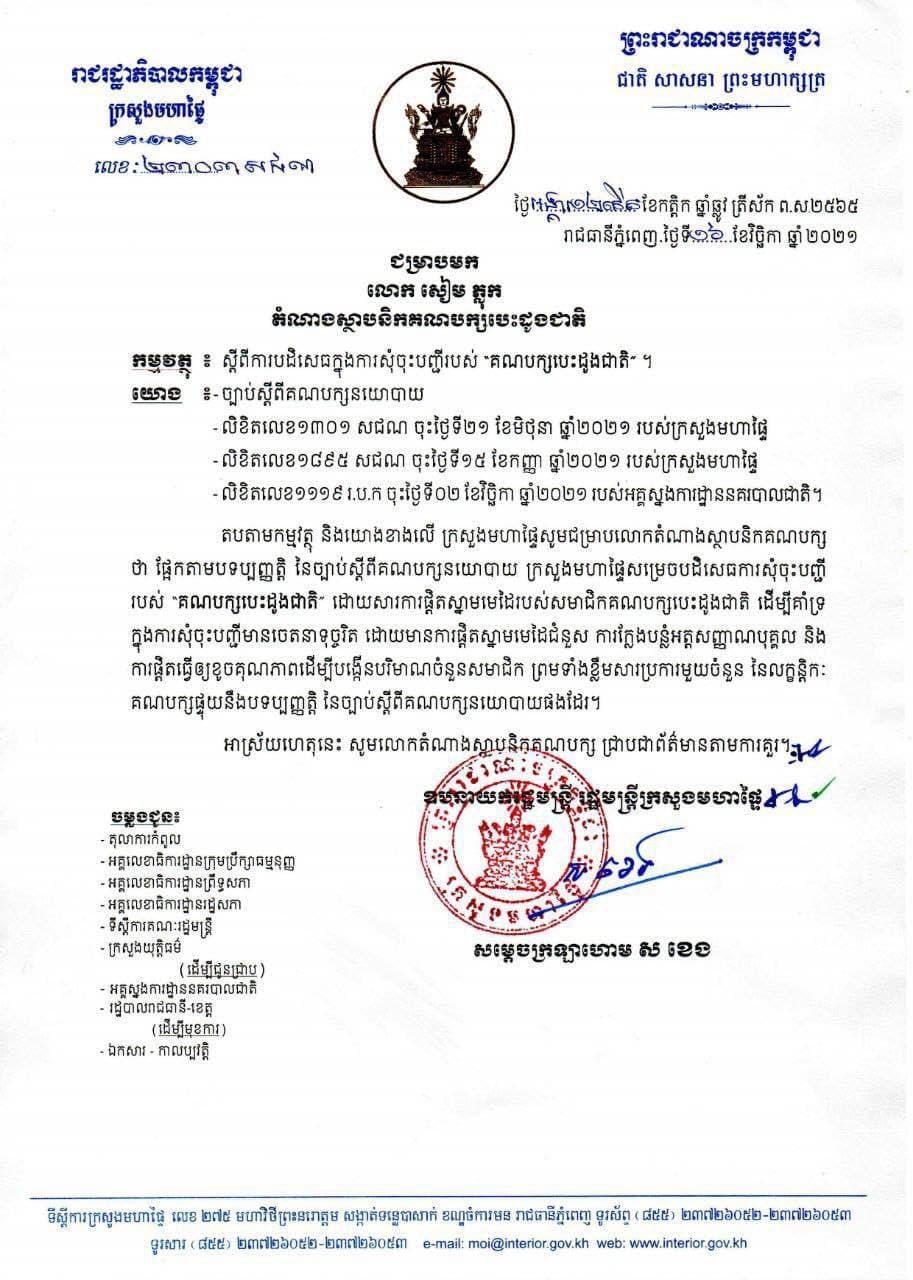 ក្រសួងមហាផ្ទៃ សម្រេចបដិសេធការសុំចុះបញ្ជី គណបក្សបេះដូងជាតិ