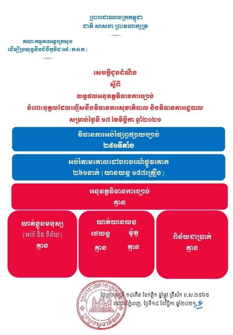 នេះបើតាមសេចក្តីប្រកាសរបស់ គណ:កម្មការដឹកនាំការអនុវត្តច្បាប់កូវីដ-១៩ ។