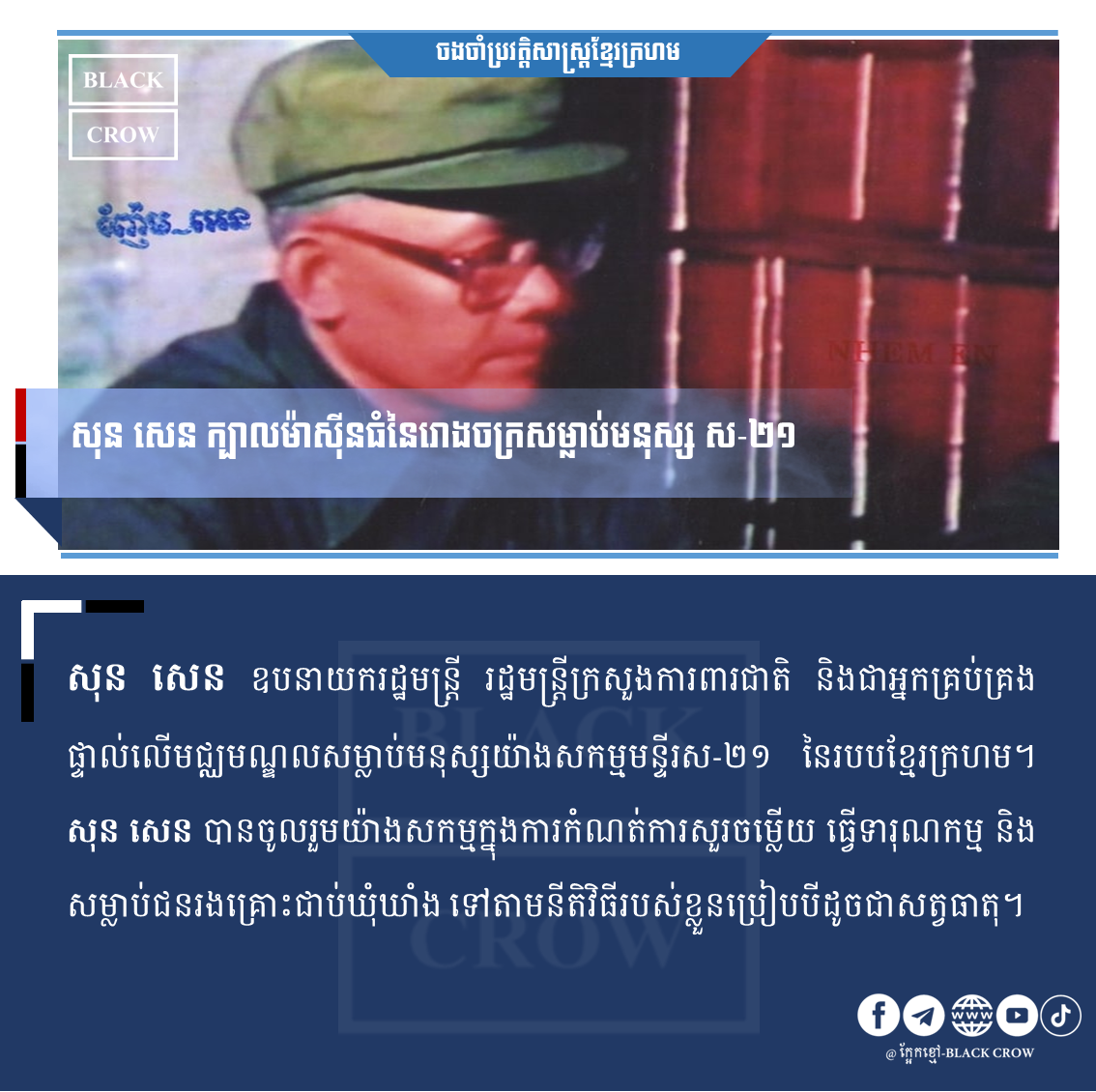 សុន សេន ក្បាលម៉ាស៊ីនធំនៃរោងចក្រសម្លាប់មនុស្ស ស-២១ក្អែកខ្មៅឯកសារសំណេរអត្ថបទដោយ៖លី ប៊ុនហេង - Ly Bunheng #សុនសេន #កម្ពុជាប្រជាធិបតេយ្យ #ខ្មែរក្រហម #មន្ទីរសន្តិបាល #S21 #ស២១ Facebook Page: Black-Crow Telegram Channel លី ប៊ុនហេង - Ly Bunhengលី ប៊ុនហេង ប្រធានផ្នែកផ្សព្វផ្សាយ នៃសច្ចធម៌ប្រវត្តិសាស្រ្ដអត្ថបទមុនអត្ថបទបន្ទាប់