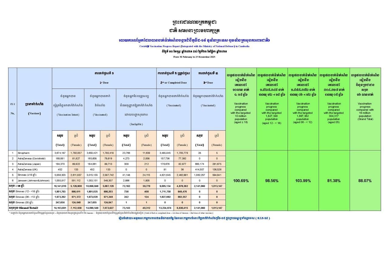ភ្នំពេញ ៖ គិតត្រឹមយប់ថ្ងៃទី២១ ខែវិច្ឆិកា ឆ្នាំ២០២១ ក្រសួងសុខាភិបាល និងក្រសួងការពារជាតិ បានចាក់វ៉ាក់សាំងការពារកូវីដ១៩ ជូនមន្រ្តីរាជការ ប្រជាពលរដ្ឋ និងកងកម្លាំងប្រដាប់អាវុធ នៅទូទាំងប្រទេសសរុបចំនួន ១៤,០៩០,៥៤៨នាក់។ ក្នុងនោះរួមមាន៖