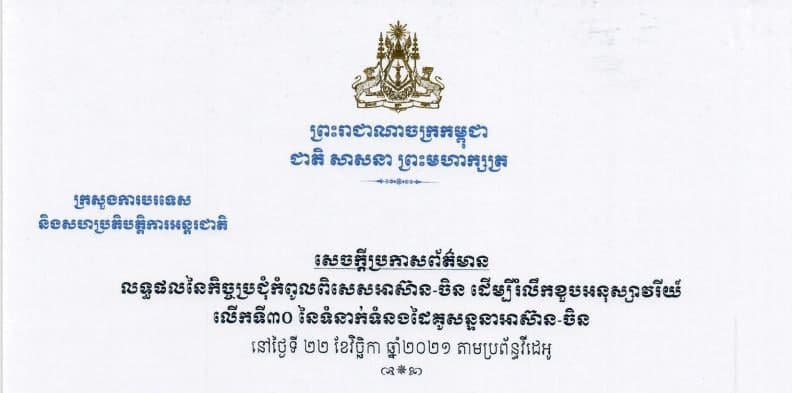 លទ្ធផលកិច្ចប្រជុំកំពូលពិសេសអាស៊ាន-ចិន ដើម្បីរំលឹកខួបអនុស្សាវរីយ៍ លើកទី៣០ នៃទំនាក់ទំនងដៃគូសន្ទនាអាស៊ាន-ចិន តាមប្រព័ន្ធវីដេអូOne-Minuteនយោបាយអត្ថបទដោយ៖AMS OneMinute ២២ វិច្ឆិកា ២០២១ Final_KH_Outcomes_of_ASEAN_China_Special_Summit_22_Nov_2021Download Final_ENG_Outcomes_of_ASEAN_China_Special_Summit_22_Nov_2021Download AMS OneMinuteអត្ថបទមុនអត្ថបទបន្ទាប់
