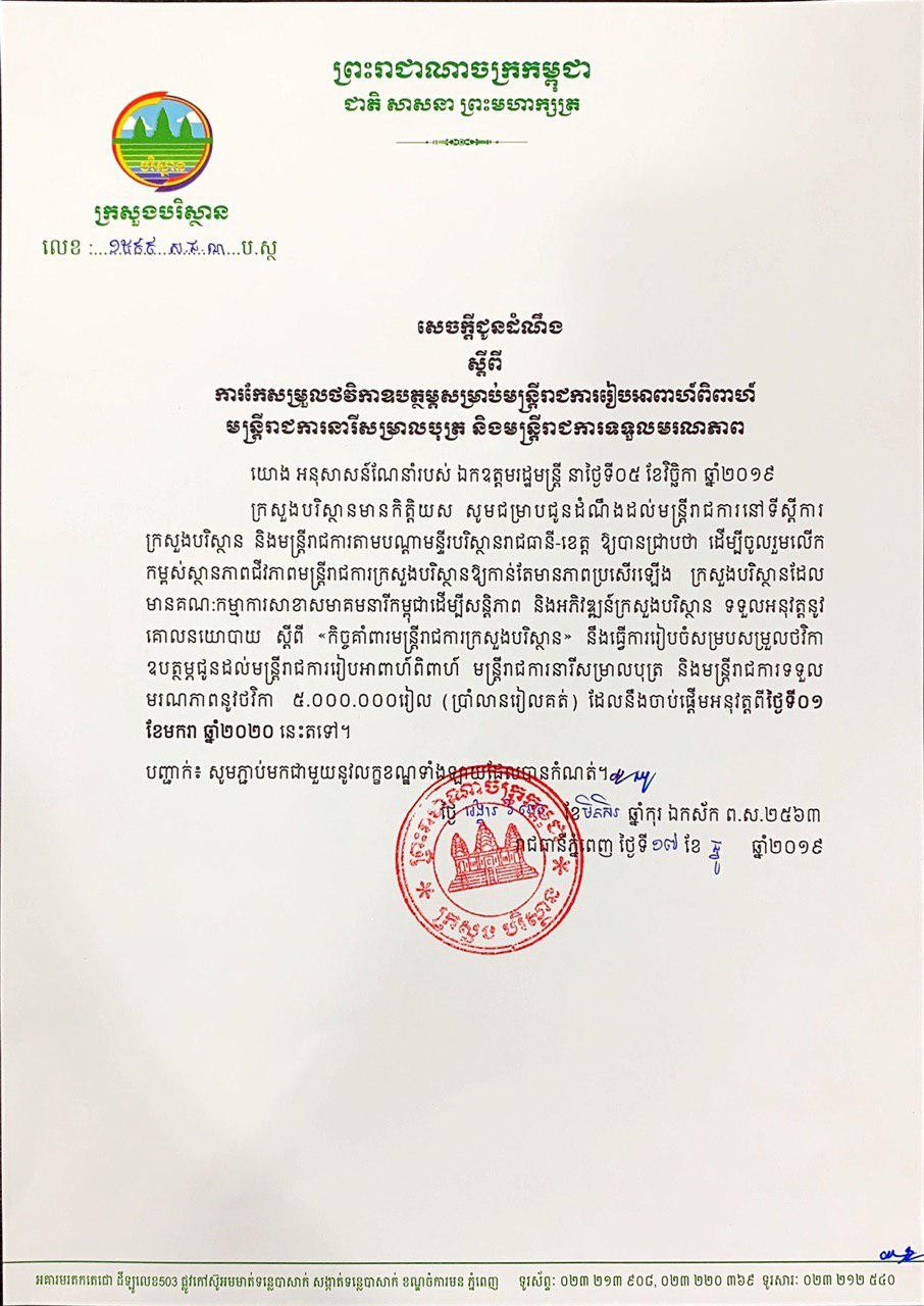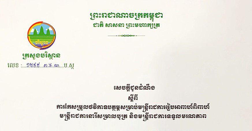 ក្រសួងបរិស្ថាន៖ សេចក្តីជូនដំណឹង ស្តីពីការកែសម្រួលថវិកាឧបត្ថម្ភសម្រាប់បន្ត្រីរាជការរៀបអាពាហ៍ពិពាហ៍ មន្ត្រីរាជការនារីសម្រាលបុត្រ និងមន្ត្រីរាជការទទួលមរណភាពព័ត៌មានអត្ថបទដោយ៖Kien Sereyvuth Kien SereyvuthIT Technical Supportអត្ថបទមុនអត្ថបទបន្ទាប់