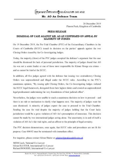យោងតាមសេចក្តីប្រកាសព័ត៌មានរបស់ ក្រុមមេធាវីការពារក្តី លោក អោ អានបានចេញផ្សាយនៅថ្ងៃទី២០ ខែធ្នូ ឆ្នាំ២០១៩ បានអោយដឹងថា ចៅក្រមភាគច្រើននៃអង្គបុរេជំនុះជម្រះបានបញ្ជាក់ពីការលើកលែងការចោទ ប្រកាន់ក្នុងបណ្តឹងឧទ្ធរណ៍លើ លោក អោ អាន ត្រូវបានបញ្ជាក់នៅបណ្តឹង។ នៅថ្ងៃទី ១៩ ខែធ្នូ ឆ្នាំ ២០១៩ អង្គបុរេជំនុំជិះនៃអង្គជំនុំជម្រះវិសាមញ្ញក្នុងតុលាការកម្ពុជាបានចេញសេចក្តីសម្រេចរបស់ខ្លួនលើបណ្តឹងឧទ្ធរណ៍របស់ភាគីនានាជំទាស់នឹងដីកាដំណោះស្រាយពីរផ្ទុយគ្នាដែលចេញដោយសហចៅក្រមស៊ើបអង្កេត ។