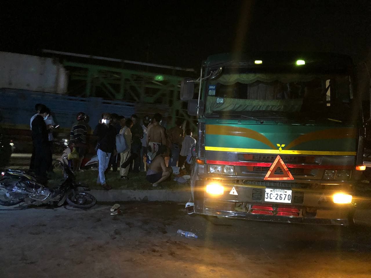 នារីម្នាក់ស្លាប់ និងបុរសម្នាក់ទៀតរបួសធ្ងន់ ខណៈកំពុងជិះម៉ូតូស្របគ្នាត្រូវរថយន្តកុងតឺន័របើកឡើងសួនពុះចែកទ្រូងផ្លូវ២១៧ មកបុករះទាំងកំរោល