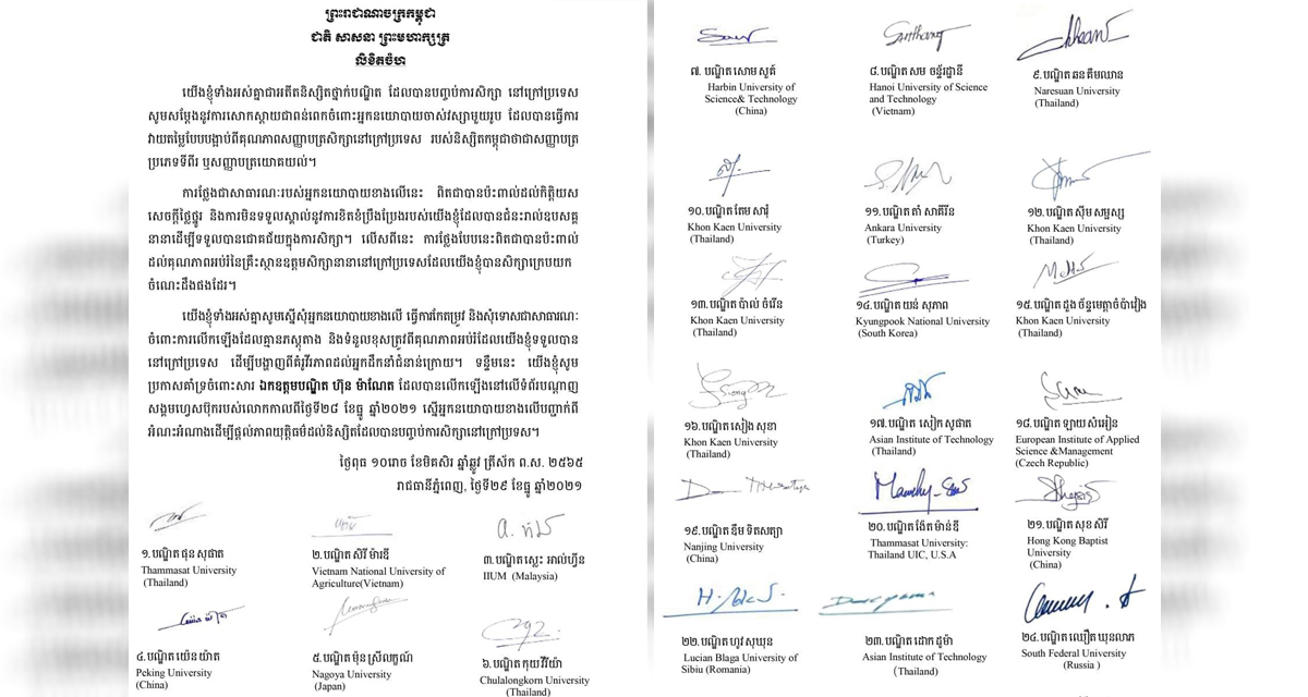 នៅក្នុងលិខិតចំហដែលឈ្មោះ និងមានចុះហត្ថលេខាផងបានបញ្ជាក់ថា ការថ្លែងជាសាធារណៈរបស់អ្នកនយោបាយខាងលើនេះ ពិតជាបានប៉ះពាល់ដល់កិត្តិយស សេចក្តីថ្លៃថ្នូរ និងការមិនទទួលស្គាល់នូវការខិតខំប្រឹងប្រែងរបស់យើងខ្ញុំដែលបានជម្នះរាល់ឧបសគ្គនានា ដើម្បីទទួលបានជោគជ័យក្នុងការសិក្សា។ លើសពីនេះ ការថ្លែងបែបនេះ ពិតជាបានប៉ះពាល់ដល់គុណភាពអប់រំនៃគ្រឹះស្ថានឧត្តមសិក្សានានានៅក្រៅប្រទេសដែលយើងខ្ញុំបានសិក្សាក្រេបយកចំណេះដឹងផងដែរ។ ជាមួយគ្នានេះ អតីតនិស្សិតថ្នាក់បណ្ឌិតដែលបានបញ្ចប់ការសិក្សានៅក្រៅប្រទេសទាំងអស់គ្នា សូមស្នើសុំអ្នកនយោបាយចាស់វង្សាខាងលើ ធ្វើការកែតម្រូវ និងសុំទោសជាសាធារណៈ ចំពោះការលើកឡើងដែលគ្មានភស្តុតាង និងទំនួលខុសត្រូវពីគុណភាពអប់រំដែលពួកគេទទួលបាននៅក្រៅប្រទេស ដើម្បីបង្ហាញពីគំរូវីរភាពដល់អ្នកដឹកនាំជំនាន់ក្រោយ។ ទន្ទឹមនេះ សូមប្រកាសគាំទ្រចំពោះសារឯកឧត្តមបណ្ឌិត ហ៊ុន ម៉ាណែត ដែលបានលើកឡើងនៅលើទំព័របណ្ដាញសង្គមហ្វេសប៊ុករបស់លោកកាលពីថ្ងៃទី២៨ ខែធ្នូ ឆ្នាំ២០២១ ស្នើអ្នកនយោបាយខាងលើបញ្ជាក់ពីអំណះអំណាងដើម្បីផ្ដល់ភាពយុត្តិធម៌ដល់និស្សិតដែលបានបញ្ចប់ការសិក្សានៅក្រៅប្រទស។
