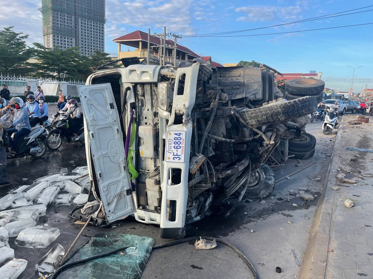 រថយន្តមួយគ្រឿង បុរះឡើងខឿនទ្រូងផ្លូវក្រឡាប់ផ្ងារជើងចាក់ទឹកកកចោលពេញផ្លូវ បណ្តាលឱ្យរងការខូចខាតយ៉ាងដំណំ