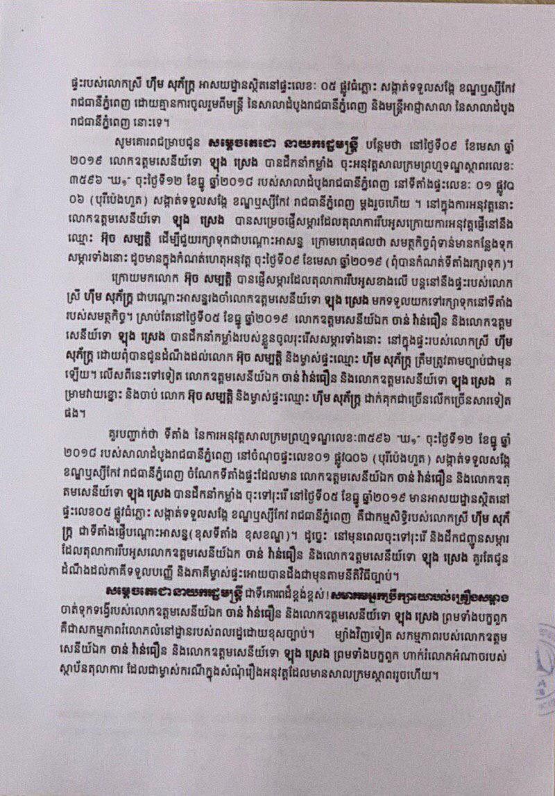 លិខិតដដែលនេះ បញ្ជាក់ថា កាលពីថ្ងៃទី០៩ ខែមេសា ឆ្នាំ២០១៩ កន្លងទៅលោកឧត្ដមសេនីយ៍ទោ ឡុង ស្រេង បានដឹកនាំកម្លាំង ចុះអនុវត្តសាលក្រមព្រហ្មទណ្ឌស្ថាពរលេខៈ ៣៥៩៦ “ឃ១” ចុះថ្ងៃទី១២ ខែធ្នូ ឆ្នាំ២០១៨ របស់សាលាដំបូងរាជធានីភ្នំពេញ នៅទីតាំងផ្ទះលេខៈ ០១ ផ្លូវQ០៦ (បុរីប៉េងហួត) សង្កាត់ទទួលសង្កែ ខណ្ឌឬស្សីកែវ រាជធានីភ្នំពេញ ម្ដងរួចហើយ ។ នៅក្នុងការអនុវត្តនោះ លោកឧត្ដមសេនីយ៍ទោ ឡុង ស្រេង បានសម្រេចផ្ញើសម្ភារដែលតុលាការរឹបអូសក្រោយការអនុវត្តផ្ញើនៅនឹងឈ្មោះ អ៊ុច សម្បត្តិ ដើម្បីជួយរក្សាទុកជាបណ្ដោះអាសន្ន ក្រោមហេតុផលថា សមត្ថកិច្ចពុំទាន់មានកន្លែងទុកសម្ភារទាំងនោះ ដូចមានក្នុងកំណត់ហេតុអនុវត្ត ចុះថ្ងៃទី០៩ ខែមេសា ឆ្នាំ២០១៩ (ពុំបានកំណត់ទីតាំងរក្សាទុក)។