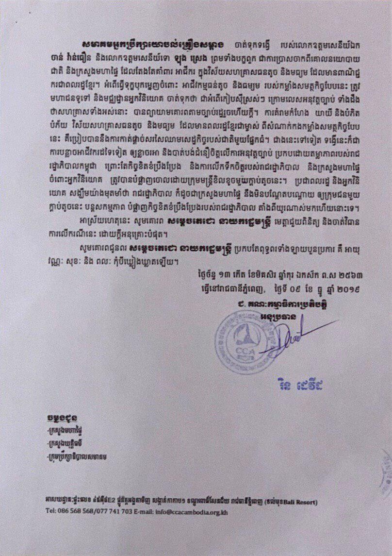 ជាងនេះទៅទៀត ទង្វើនេះក៏ជាការបន្លាចអាជីវករដទៃទៀត ឲ្យខ្លាចរអា និងបាត់បង់ជំនឿចិត្តលើការអនុវត្តច្បាប់ ប្រកបដោយតម្លាភាពរបស់រាជរដ្ឋាភិបាលកម្ពុជា ព្រោះតែកិច្ចខិតខំប្រឹងប្រែង និងការលើកទឹកចិត្តរបស់រាជរដ្ឋាភិបាល និងក្រសួងមហាផ្ទៃ ចំពោះអ្នកវិនិយោគ ត្រូវបានបំផ្លាញចោលដោយក្រុមមន្ត្រីខិលខូចមួយក្តាប់តូចនេះ។