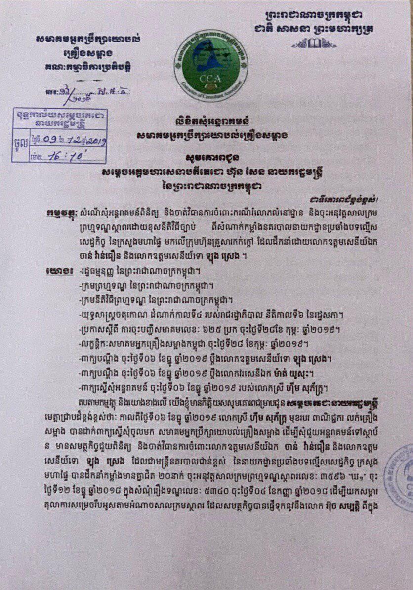 ភ្នំពេញ៖ សមាគមអ្នកប្រឹក្សាយោបល់គ្រឿងសម្អាង កាលពីថ្ងៃទី០៩ ខែធ្នូ ឆ្នាំ២០១៩បានដាក់លិខិតសុំអន្តរាគមន៍ ចូលខុទ្ទការល័យ របស់សម្តេចអគ្គមហាសេនាបតីតេជោ ហ៊ុន សែន នាយករដ្ឋមន្ត្រី នៃព្រះរាជាណាចក្រកម្ពុជា ដើម្បីឲ្យសម្តេចជួយរកយុត្តិធម៌ ពាក់ព័ន្ធករណី មន្ត្រីជាន់ខ្ពស់ នៃនាយកដ្ឋានប្រឆាំងបទល្មើសសេដ្ឋកិច្ច ក្រសួងមហាផ្ទៃ ចុះអនុវត្តច្បាប់ខុសនីតិវិធី ក្លាយជាការយាយី ដល់អាជីវករដែលរកស៊ីស្របច្បាប់។