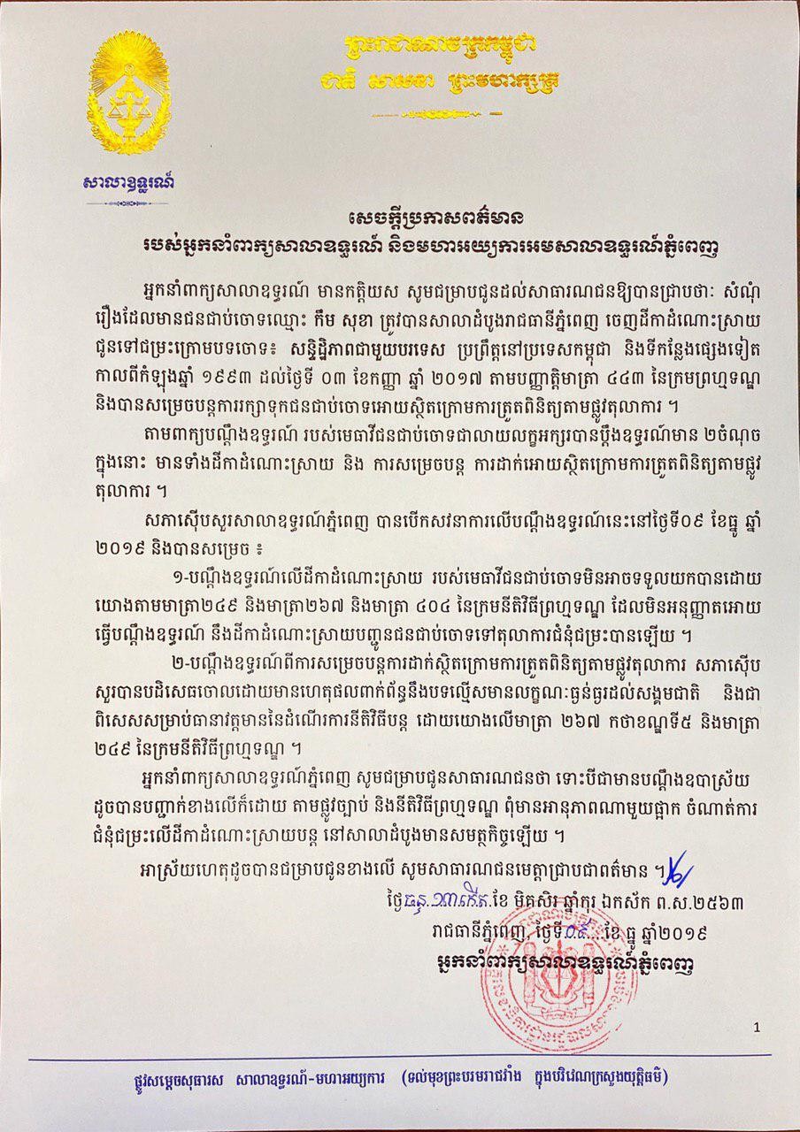 សេចក្តីប្រកាសព័ត៌មានរបស់អ្នកនាំពាក្យសាលាឧទ្ទរណ៍ និងមហាអយ្យការអមសាលាឧទ្ទរណ៍ភ្នំពេញព័ត៌មានអត្ថបទដោយ៖Kien Sereyvuth Kien SereyvuthIT Technical Supportអត្ថបទមុនអត្ថបទបន្ទាប់
