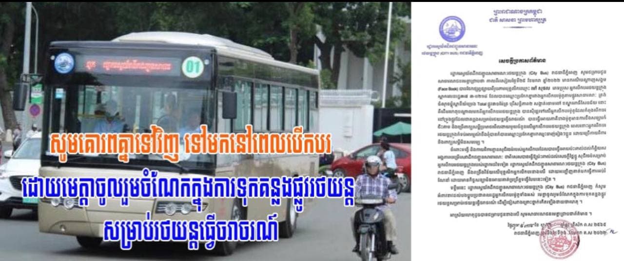 រដ្ឋបាលរាជធានីភ្នំពេញ ចេញសេចក្ដីប្រកាសព័ត៌មាន រដ្ឋាករស្វយ័តដឹកជញ្ជូនសាធារណៈរថយន្តក្រុង (City Bus) រាជធានីភ្នំពេញ សូមអំពាវនាវដល់បងប្អូនប្រជាពលរដ្ឋអ្នកបើកបរម៉ូតូទាំងអស់ មេត្តាចូលរួមចំណែកក្នុងការទុកគន្លងផ្លូវរថយន្ត សម្រាប់រថយន្តធ្វើចរាចរណ៍ ដើម្បីចៀសវាងគ្រោះថ្នាក់ជាយថាហេតុ ៕