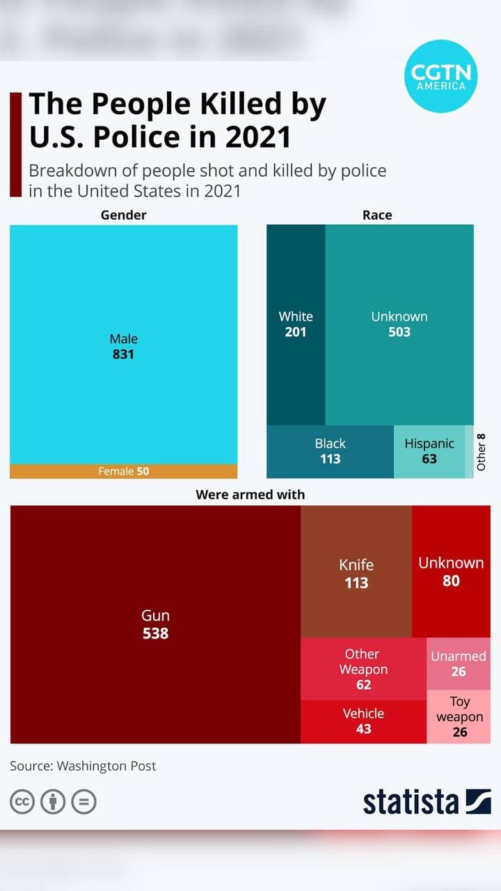 មនុស្សចំនួន ៨៨៨នាក់នៅអាមេរិក ត្រូវបានបាញ់សម្លាប់ដោយប៉ូលិសអាមេរិក ក្នុងឆ្នាំ២០២១។ អ្នកស្លាប់ភាគច្រើនជាមនុស្សប្រុស និងប្រដាប់ដោយអាវុធ។