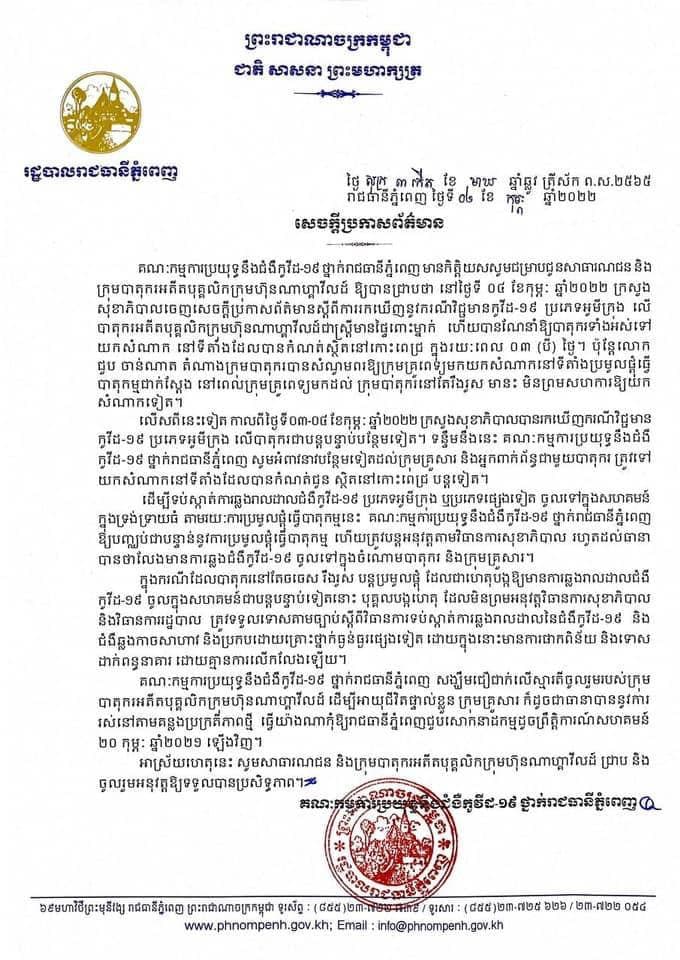 រដ្ឋបាលរាជធានីភ្នំពេញបានប្រកាសដល់ក្រុមបាតុករ ដែលជាអតីតបុគ្គលិកណាហ្គាវើលដ៍ទាំងអស់ ឲ្យបញ្ឈប់ជាបន្ទាន់នូវការប្រមូលផ្តុំធ្វើបាតុកម្ម ដើម្បីទប់ស្កាត់ការឆ្លងរាលដាលជំងឺកូវីដ-១៩ ប្រភេទអូមីក្រុង ក្នុងទ្រង់ទ្រាយធំ