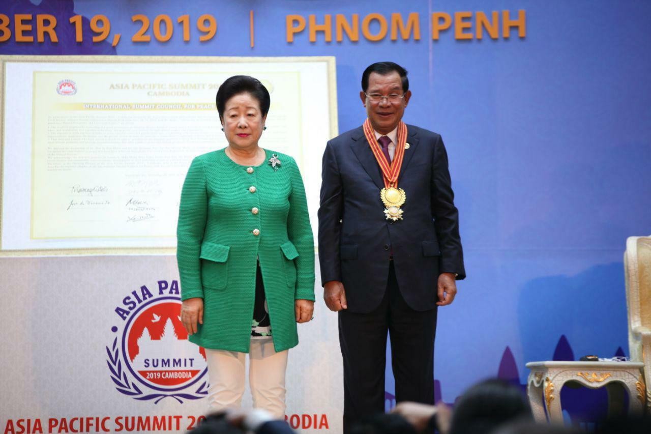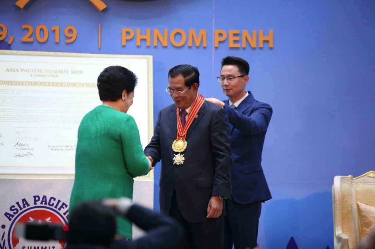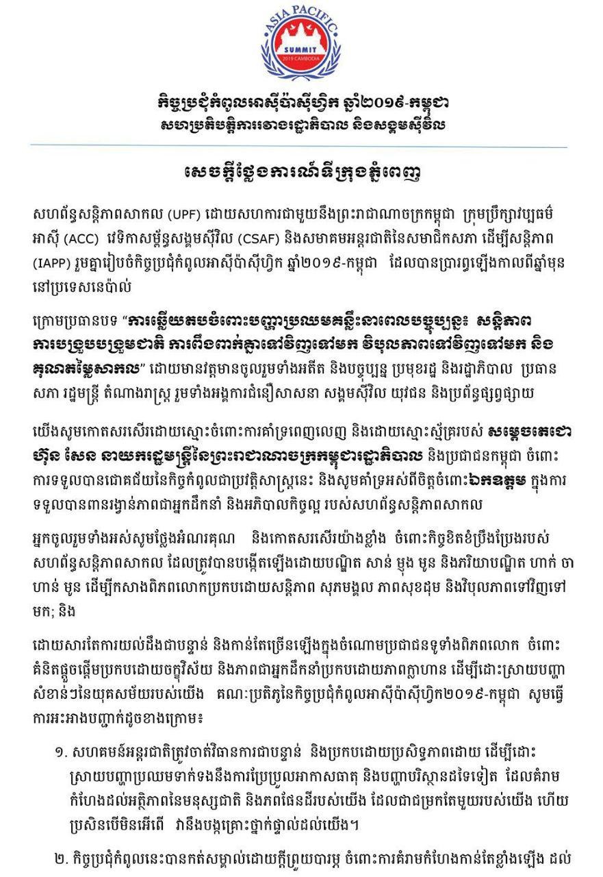 សេចក្តីថ្លែងការណ៍ទីក្រុងភ្នំពេញ បានបញ្ជាក់ថា យើងសូមកោតសរសើរដោយស្មោះចំពោះការគាំទ្រពេញលេញ និងដោយស្មោះស្ម័គ្ររបស់ សម្តេចតេជោហ៊ុន សែន នាយករដ្ឋមន្រ្តី នៃព្រះរាជាណាចក្រកម្ពុជា រដ្ឋាភិបាល និងប្រជាជនកម្ពុជា ចំពោះការទទួលបានជោគជ័យ នៃកិច្ចកំពូលជាប្រវត្តិសាស្ត្រនេះ និងសូមគាំទ្រអស់ពីចិត្តចំពោះឯកឧត្តម ក្នុងការទទួលបានពានរង្វាន់ភាពជាអ្នកដឹកនាំ និងអភិបាលកិច្ចល្អ របស់សហព័ន្ធសន្តិភាពសាកល អ្នកចូលរួមទាំងអស់សូមថ្លែងអំណរគុណ និងកោតសរសើរយ៉ាងខ្លាំង ចំពោះកិច្ចខិតខំប្រឹងប្រែងរបស់ សហព័ន្ធសន្តិភាពសាកល ដែលត្រូវបានបង្កើតឡើងដោយ បណ្ឌិត សាន់ ម្ញុង មូន និងភរិយា បណ្ឌិត ហាក់ ចា ហាន់ មូន ដើម្បីកសាងពិភពលោកប្រកបដោយសន្តិភាព សុភមង្គល ភាពសុខដុម និងវិបុលភាពទៅវិញទៅមក; និងដោយសារតែការយល់ដឹងជាបន្ទាន់ និងកាន់តែច្រើនឡើងក្នុងចំណោមប្រជាជនទូទាំងពិភពលោក ចំពោះគំនិតផ្តួចផ្តើមប្រកបដោយចក្ខុវិស័យ និងភាពជាអ្នកដឹកនាំប្រកបដោយភាពក្លាហាន ដើម្បីដោះស្រាយបញ្ហាសំខាន់ៗ នៃយុគសម័យរបស់យើង គណៈប្រតិភូនៃកិច្ចប្រជុំកំពូលអាស៊ីប៉ាស៊ីហ្វិក ២០១៩-កម្ពុជា។