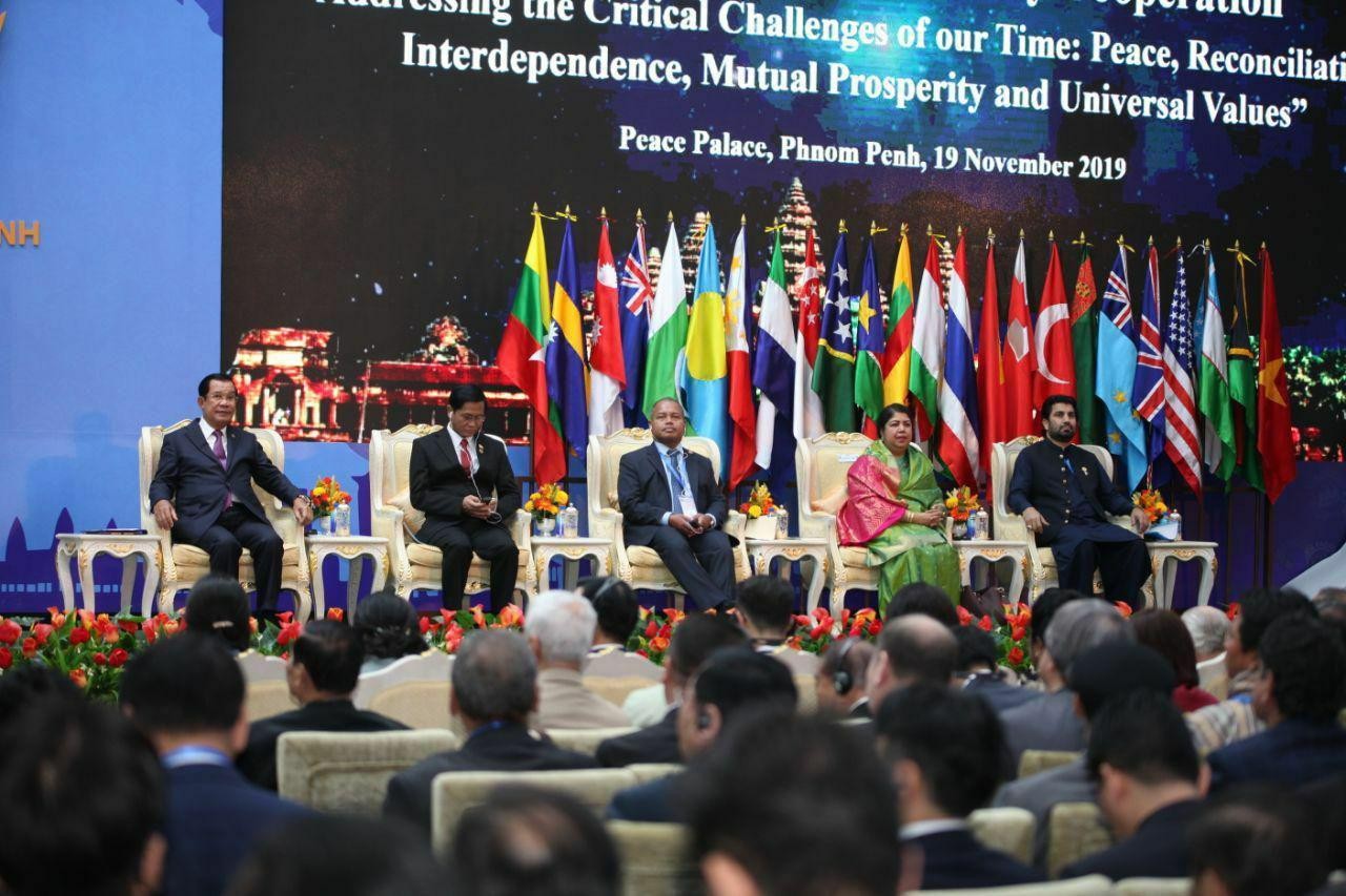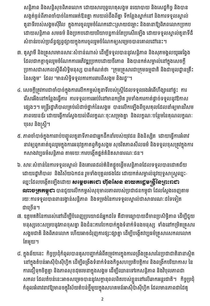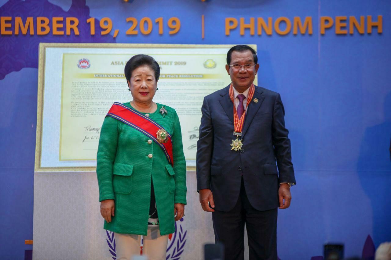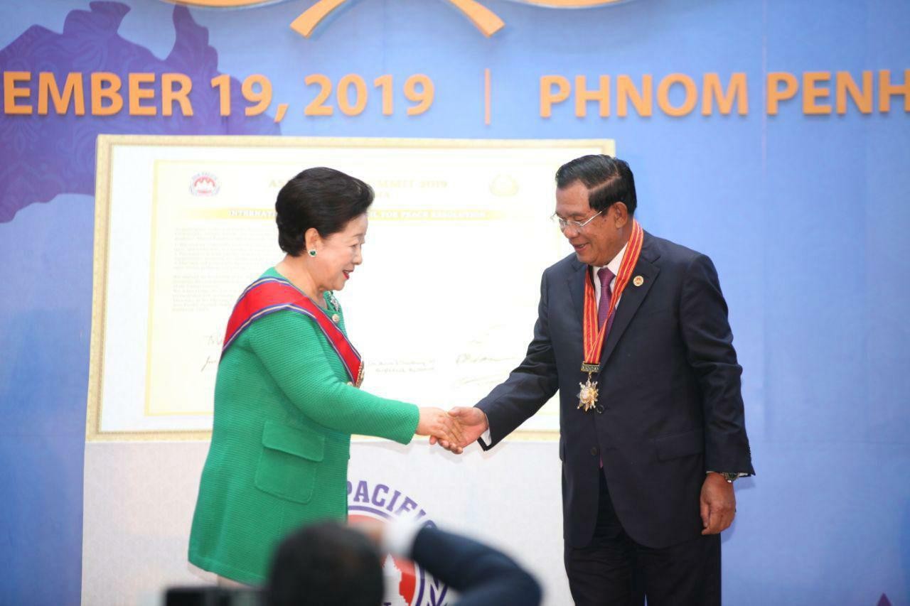 សេចក្តីថ្លែងការណ៍ទីក្រុងភ្នំពេញ បានបញ្ជាក់ថា យើងសូមកោតសរសើរដោយស្មោះចំពោះការគាំទ្រពេញលេញ និងដោយស្មោះស្ម័គ្ររបស់ សម្តេចតេជោហ៊ុន សែន នាយករដ្ឋមន្រ្តី នៃព្រះរាជាណាចក្រកម្ពុជា រដ្ឋាភិបាល និងប្រជាជនកម្ពុជា ចំពោះការទទួលបានជោគជ័យ នៃកិច្ចកំពូលជាប្រវត្តិសាស្ត្រនេះ និងសូមគាំទ្រអស់ពីចិត្តចំពោះឯកឧត្តម ក្នុងការទទួលបានពានរង្វាន់ភាពជាអ្នកដឹកនាំ និងអភិបាលកិច្ចល្អ របស់សហព័ន្ធសន្តិភាពសាកល អ្នកចូលរួមទាំងអស់សូមថ្លែងអំណរគុណ និងកោតសរសើរយ៉ាងខ្លាំង ចំពោះកិច្ចខិតខំប្រឹងប្រែងរបស់ សហព័ន្ធសន្តិភាពសាកល ដែលត្រូវបានបង្កើតឡើងដោយ បណ្ឌិត សាន់ ម្ញុង មូន និងភរិយា បណ្ឌិត ហាក់ ចា ហាន់ មូន ដើម្បីកសាងពិភពលោកប្រកបដោយសន្តិភាព សុភមង្គល ភាពសុខដុម និងវិបុលភាពទៅវិញទៅមក; និងដោយសារតែការយល់ដឹងជាបន្ទាន់ និងកាន់តែច្រើនឡើងក្នុងចំណោមប្រជាជនទូទាំងពិភពលោក ចំពោះគំនិតផ្តួចផ្តើមប្រកបដោយចក្ខុវិស័យ និងភាពជាអ្នកដឹកនាំប្រកបដោយភាពក្លាហាន ដើម្បីដោះស្រាយបញ្ហាសំខាន់ៗ នៃយុគសម័យរបស់យើង គណៈប្រតិភូនៃកិច្ចប្រជុំកំពូលអាស៊ីប៉ាស៊ីហ្វិក ២០១៩-កម្ពុជា។