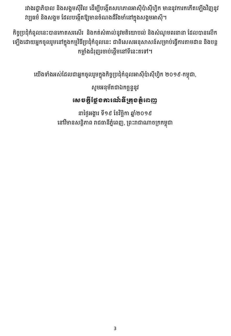 ភ្នំពេញ៖ កិច្ចប្រជុំកំពូលអាស៊ីប៉ាស៊ីហ្វិក ឆ្នាំ២០១៩-កម្ពុជា ដែលបានរៀបចំនៅប្រទេសកម្ពុជា នាថ្ងៃទី១៩ ខែវិច្ឆិកា ឆ្នាំ២០១៩ បានចេញសេចក្តីថ្លែងការណ៍រួមចំនួន៨ចំណុច។