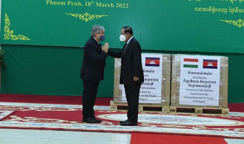 ភ្នំពេញ៖ សម្តេចអគ្គមហាសេនាបតីតេជោ ហ៊ុន សែន នាយករដ្ឋមន្ត្រីនៃព្រះរាជាណាចក្រកម្ពុជា បានអញ្ជើញទទួលវ៉ាក់សាំងបង្ការជំងឺកូវីដ-១៩ អាស្ត្រាហ្សេនីកា(Astrazeneca) ចំនួន ៥២៣,០០០ ដូស ជាជំនួយរបស់ប្រទេសហុងគ្រី ដែលពីធីប្រគល់-ទទួល វ៉ាក់សាំងនេះ ត្រូវបានធ្វើឡើងនៅ វិមានសន្តិភាព នាព្រឹកថ្ងៃទី១៨ ខែមីនា ឆ្នាំ២០២២ ។