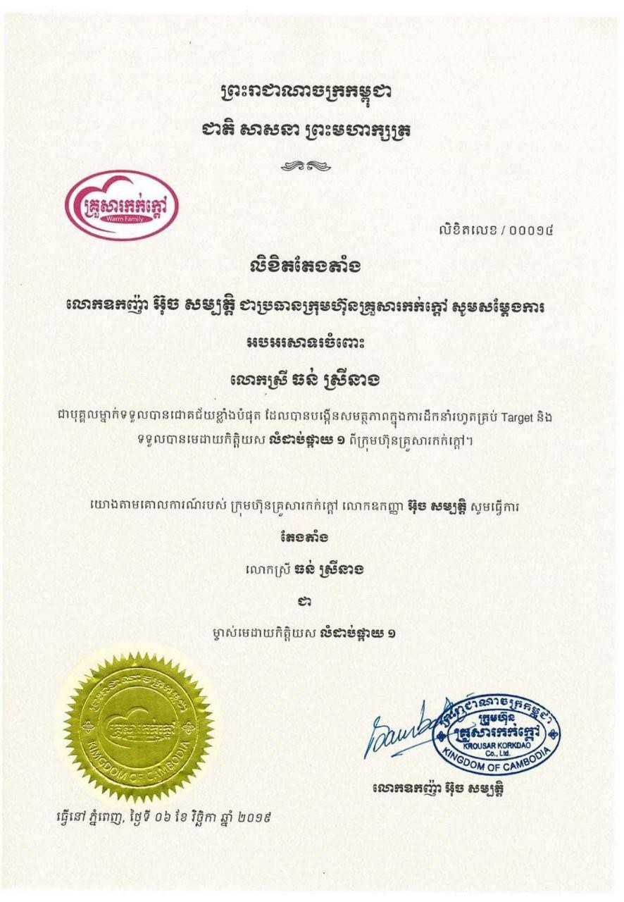 លោកស្រី ធន់ ស្រីនាង ទទួលបានការតែងតាំងមេដៃផ្កាយ១ពីក្រុមហ៊ុនគ្រួសារកក់ក្ដៅ