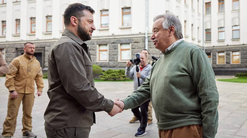 កៀវ៖ អគ្គលេខាធិការអង្គការសហប្រជាជាតិលោក អាន់តូនីញ៉ូ ហ្គូធឺរែស បានចូលរួមធ្វើសន្និសីទសារព័ត៌មានរួមគ្នាជាមួយប្រធានាធិបតីអ៊ុយក្រែនលោក វ៉ូឡូឌីមៀ ហ្សេលេនស្គី ក្នុងកំលុងបំពេញទស្សនកិច្ចមកកាន់ទីក្រុងកៀវ ក្នុងសប្តាហ៍នេះ។