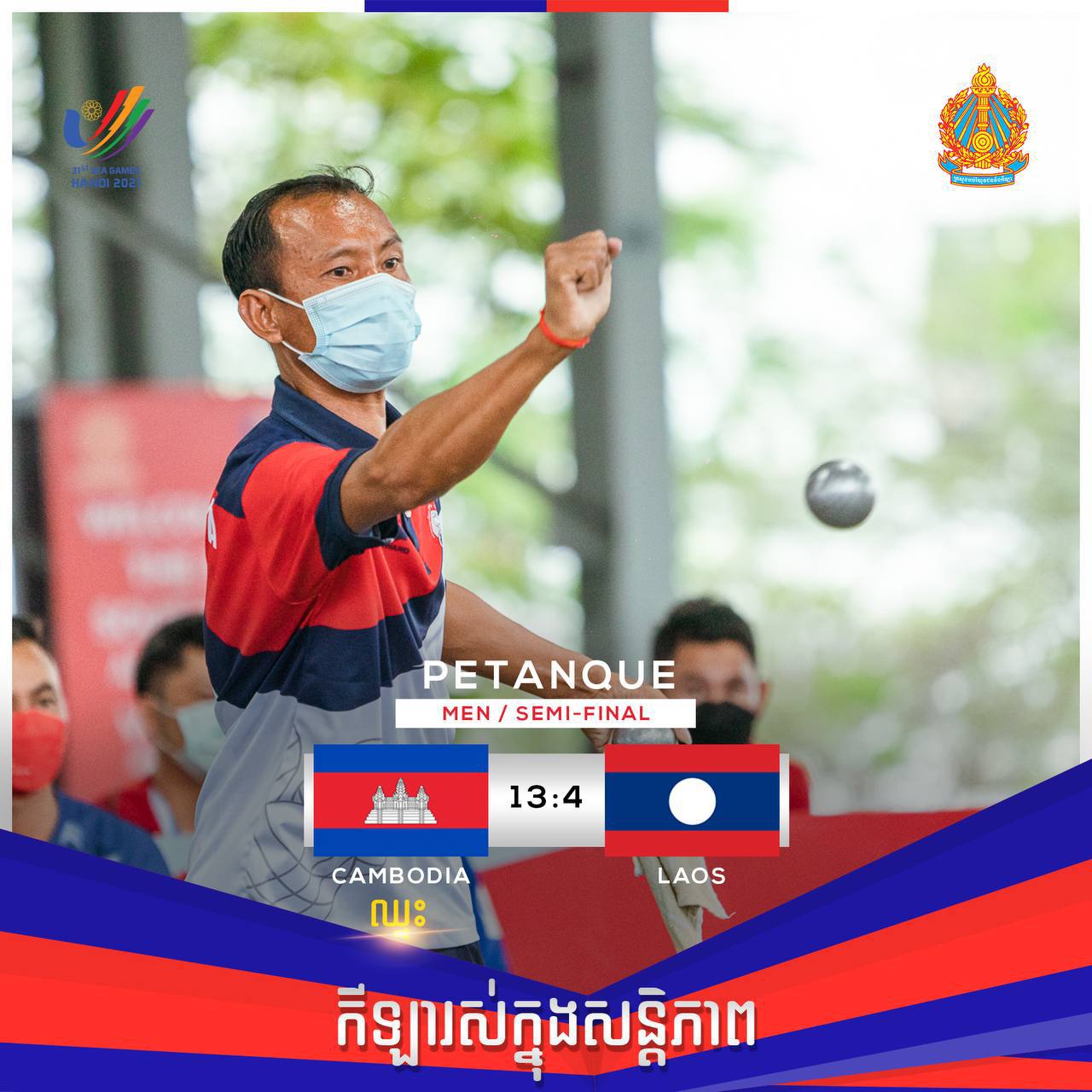 ស៊ីហ្គេម-ការប្រកួតប៉េតង់វាយជាគូបុរសវគ្គពាក់កណ្តាលផ្តាច់ព្រ័តរវាងក្រុមជម្រើសជាតិកម្ពុជាគឺកីឡាករ ថោង ឈឿន និងកីឡាករ យឹម សុភ័ណ្ឌ ជាមួយក្រុមជម្រើសជាតិឡាវជាលទ្ធផលកម្ពុជាយកឈ្នះឡាវ 13 ទល់4។ រីឯវិញ្ញាសា នារី ២នាក់ ទល់ ២នាក់