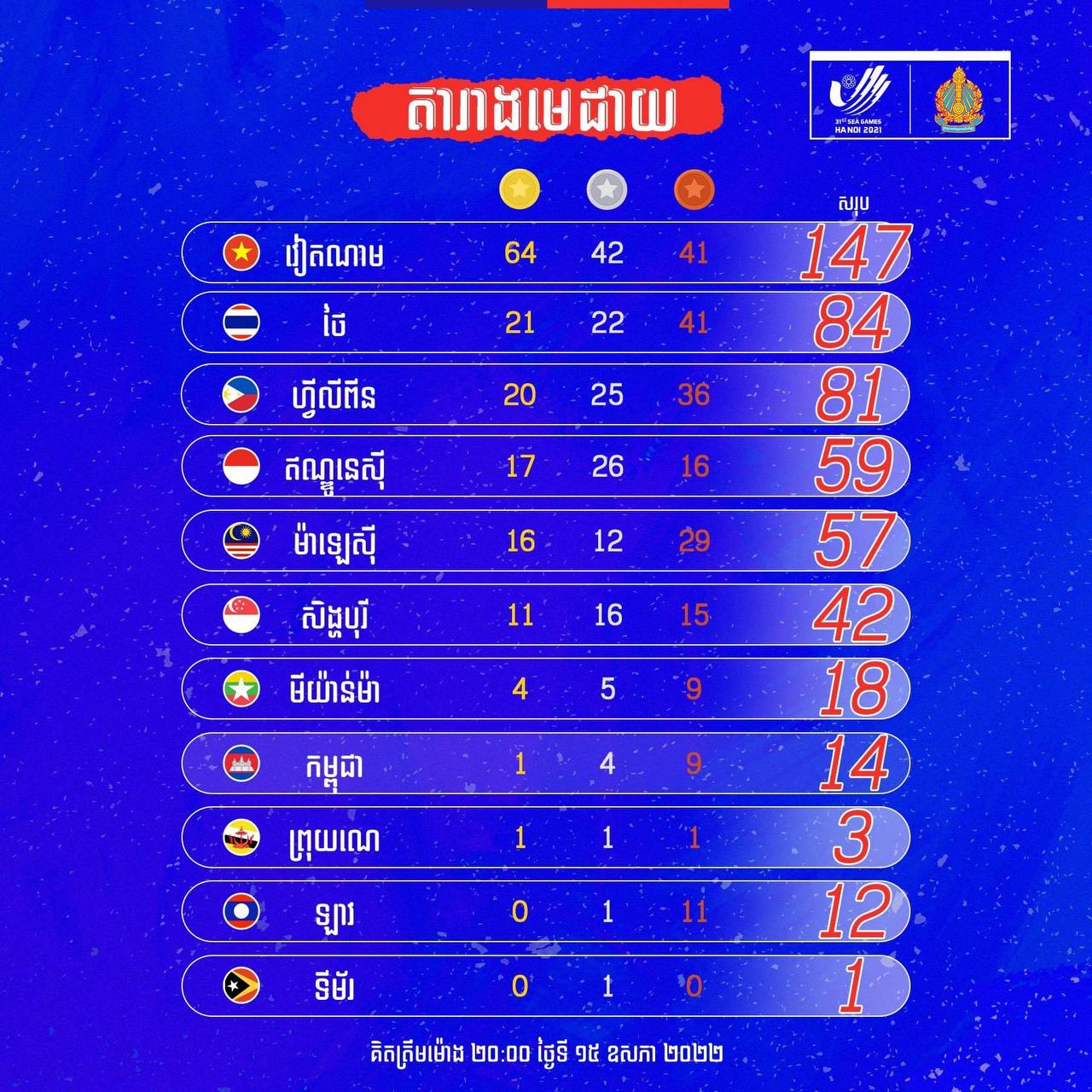 ស៊ីហ្គេម-តារាងមេដាយ ស៊ីហ្គេម លើកទី៣១ គិតត្រឹមយប់ថ្ងៃទី១៥ ខែឧសភា ឆ្នាំ២០២២ ។ កម្ពុជា ឈរលេខ៨ ដណ្តើមបានមេដាយសរុប១៤គ្រឿង មាស ១ ប្រាក់៤ និងសំរិទ្ធ៩គ្រឿង ខណ:ម្ចាស់ផ្ទះវៀតណាម ដណ្តើមបានមេដាយសរុប១៤៧គ្រឿង មាស៦៤ ប្រាក់៤២ និងសំរិទ្ធ ៤១គ្រឿង លេខ២ ថៃ ដណ្តើមបានមេដាយសរុប៨៤គ្រឿង មាស២១ ប្រាក់២២ និងសំរិទ្ធ៤១គ្រឿង លេខ៣ ដណ្តើមបានមេដាយសរុប៨១គ្រឿង មាស២០ ប្រាក់២៥ និងសំរិទ្ធ៣៦ គ្រឿង ៕ ចាន់ វិចិត្រ
