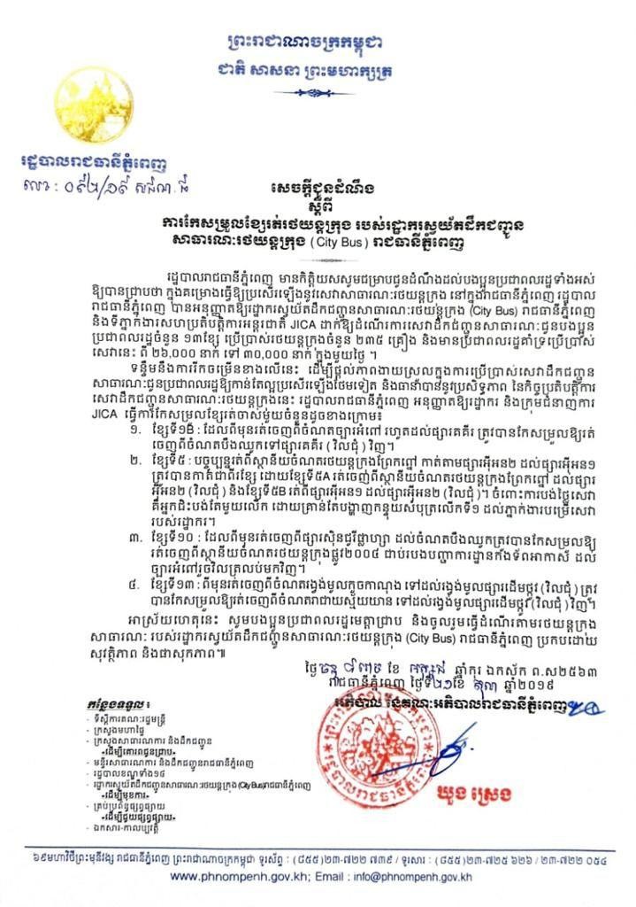 សេចក្តីជូនដំណឹងរបស់រដ្ឋបាលរាជធានីភ្នំពេញ ស្តីពីការកែសម្រួលខ្សែរត់រថយន្តក្រុង របស់រដ្ឋាករស្វយ័តដឹកជញ្ជូនសាធារណៈរថយន្តក្រុង (City Bus) រាជធានីភ្នំពេញព័ត៌មានអត្ថបទដោយ៖Kien Sereyvuth Kien SereyvuthIT Technical Supportអត្ថបទមុនអត្ថបទបន្ទាប់