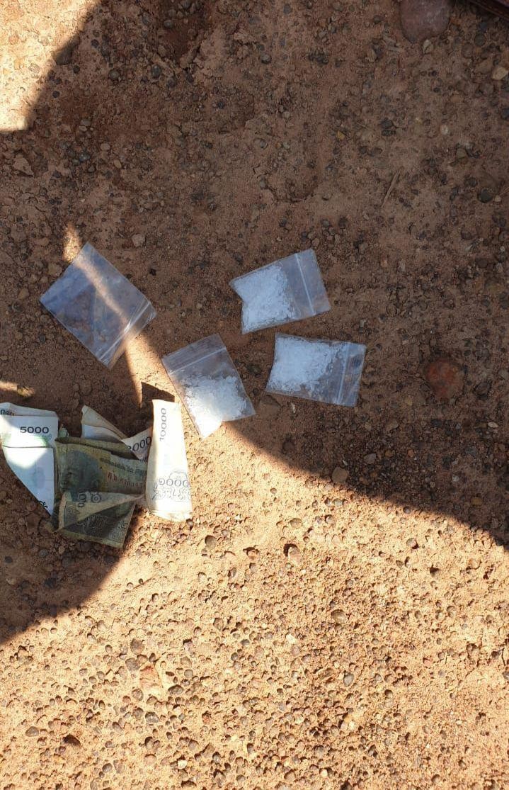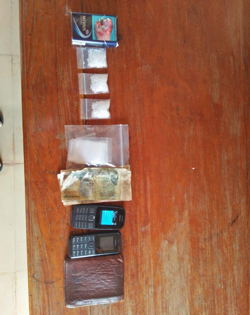 ដកហូតវត្ថុតាងបានរួមមាន៖ ១)ថ្នាំញៀន(ម៉ាទឹកកក) ចំនួន03កញ្ចប់ ទម្ងន់១២,២១ក្រាម ២)ទូរសព្ទដៃចំនួន២គ្រឿង ៣)ម៉ូតូម៉ាក Exciter ពណ៍ទឹកប៉ិច គ្មានស្លាកលេខចំនួន១គ្រឿង ៤)លុយខ្មែរចំនួន២៧០០០រៀល ៥)កាបូបដាក់លុយចំនួន១ រួមនឹងថង់សម្រាប់ច្រកគ្រឿងញៀនមួយចំនួនទៀត។