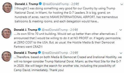 ទន្ទឹមគ្នា ប្រធានាធិបតីអាម៉េរិករូបនេះថែមទាំងបាននិយាយទៀតថា នឹងមានការពិចារណាលើទីកន្លែងផ្សេងទៀត សម្រាប់រៀបចំកិច្ចប្រជុំកំពូលឆ្នាំ២០២០នេះ ដែលអាចជានៅរមណីយដ្ឋាន ខេម ដេវីដ រដ្ឋ ម៉ារីលែន ដែលជាទីតាំងសម្រាប់លំហែកាយរបស់ប្រធានាធិបតីអាម៉េរិក។