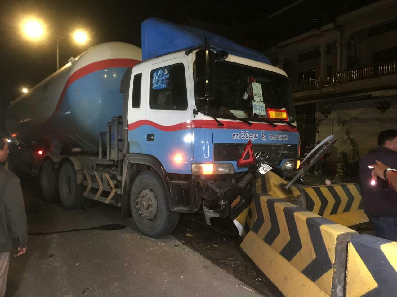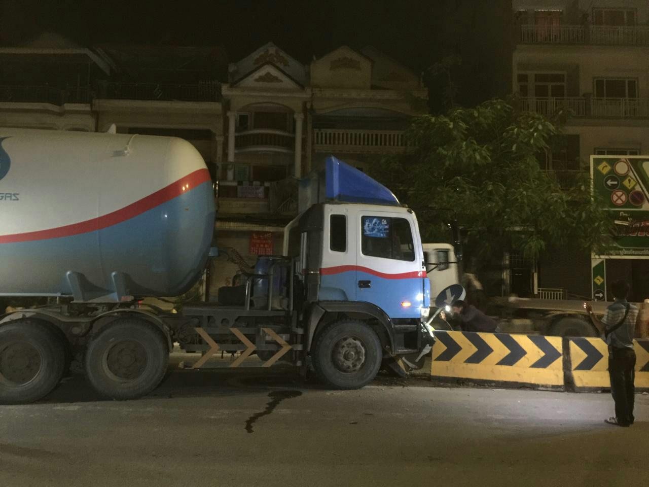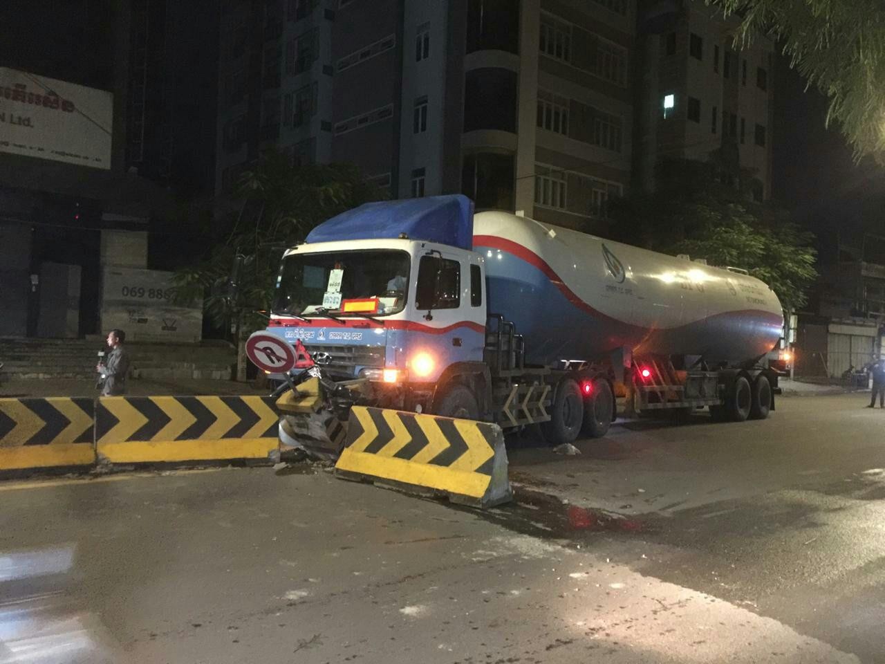 ភ្នំពេញ ៖ មានរថយន្តដឹកសាតែនហ្គាសដ៏ធំរបស់ក្រុមហ៊ុន តារា ធី សុី ហ្គាស មួយគ្រឿង បានពន្លះរបាំងថ្មពុះចែកទ្រូងផ្លូវយ៉ាងពេញទំហឹង បណ្ដាលឲ្យបាក់របាំងថ្មអស់៣កង់ កល់រថយន្តជាប់ទៅមុខលេងរួច សំណាងល្អដែរមិនបណ្ដាលឲ្យប៉ះពាល់ដល់សាតែនហ្គាសធ្វើឲ្យផ្ទុះឆេះ ។