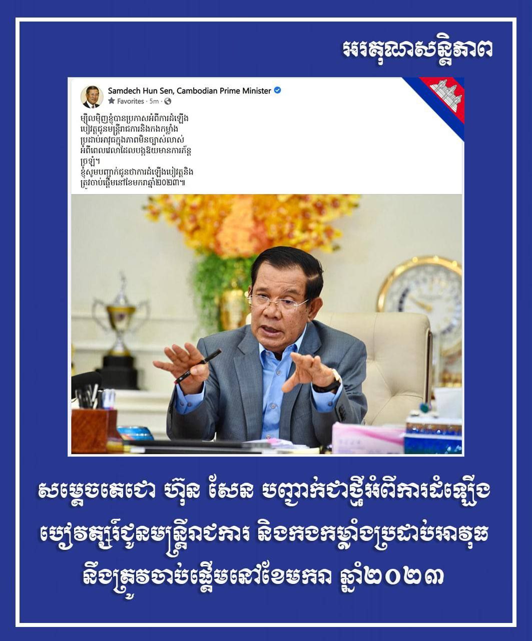សម្ដេចតេជោ ហ៊ុន សែន បានសរសេរលើទំព័រហ្វេសប៊ុកដូច្នេះថា៖ ម្សិលមិញខ្ញុំ បានប្រកាសអំពីការដំឡើងបៀវត្សជូនមន្ត្រីរាជការ និងកងកម្លាំងប្រដាប់អាវុធ ក្នុងភាពមិនច្បាស់លាស់ អំពីពេលវេលា ដែលបង្កឱយមានការភ័ន្តច្រឡំ ។