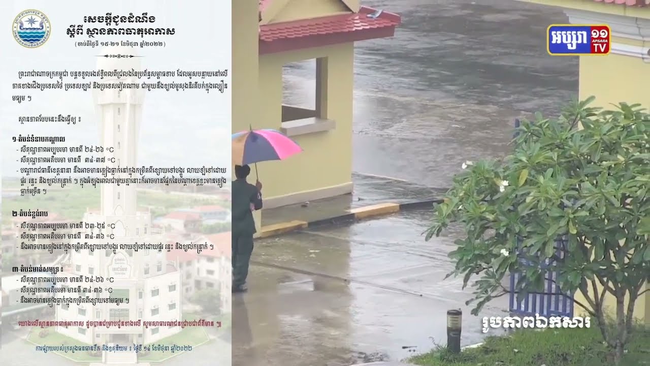 យោងតាមការព្យាករណ៍របស់ក្រសួងធនធានទឹក និងឧតុនិយម រវាងពី ថ្ងៃទី ១៥ រហូតដល់ថ្ងៃទី២១ ខែមិថុនា ឆ្នាំ២០២២នៅក្នុងតំបន់ទំនាបកណ្តាល បណ្តារាជធានី-ខេត្តនានា នឹងអាចមានភ្លៀងធ្លាក់នៅក្នុងកម្រិតពីខ្សោយទៅបង្គួរ លាយឡំទៅដោយ ផ្គរ រន្ទះ និងខ្យល់កន្ត្រាក់ ។ ក្នុងអំឡុងពេលជាមួយគ្នានោះ ក៏អាចមានផ្នែកនៃបណ្តាខេត្តខ្លះ មានភ្លៀង ធ្លាក់ច្រើន ។
