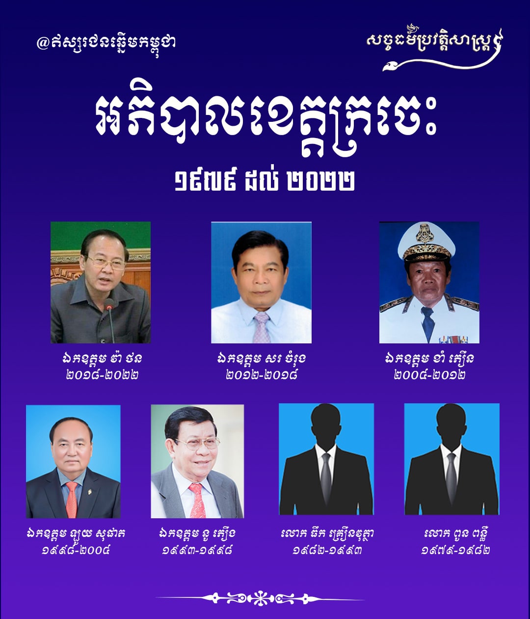 អភិបាលខេត្ដក្រចេះ ១៩៧៩ ដល់ ២០២២សច្ចធម៌ប្រវត្តិសាស្ត្រអត្ថបទដោយ៖លី ប៊ុនហេង - Ly Bunheng #សច្ចធម៌ប្រវត្ដិសាស្រ្ដ #ព្រះរាជាណាចក្រកម្ពុជា #ឥស្សរជនឆ្នើមកម្ពុជា #អភិបាលខេត្ដក្រចេះ Facebook Page: Black-CrowTelegram Channel លី ប៊ុនហេង - Ly Bunhengលី ប៊ុនហេង ប្រធានផ្នែកផ្សព្វផ្សាយ នៃសច្ចធម៌ប្រវត្តិសាស្រ្ដអត្ថបទមុនអត្ថបទបន្ទាប់